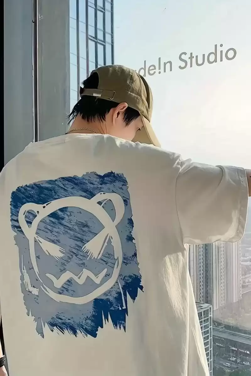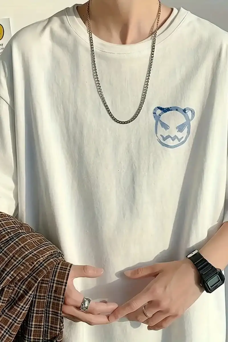 20/1 Penye Compack Bisiklet Yaka Kore tarzı sevimli ayı baskı Kısa Kol Erkek t-shirt - Beyaz