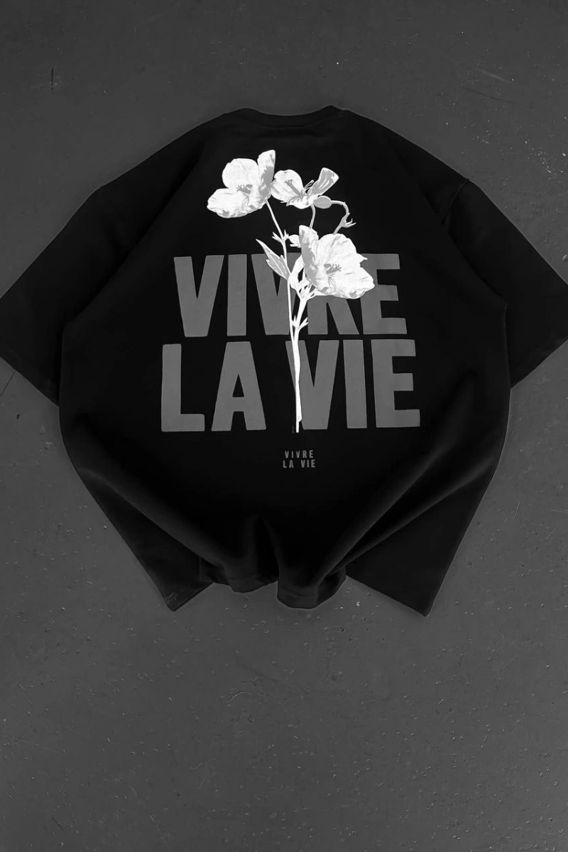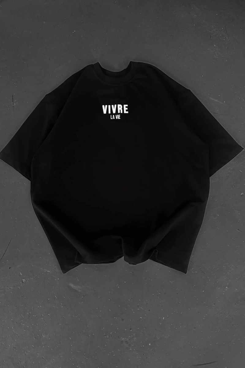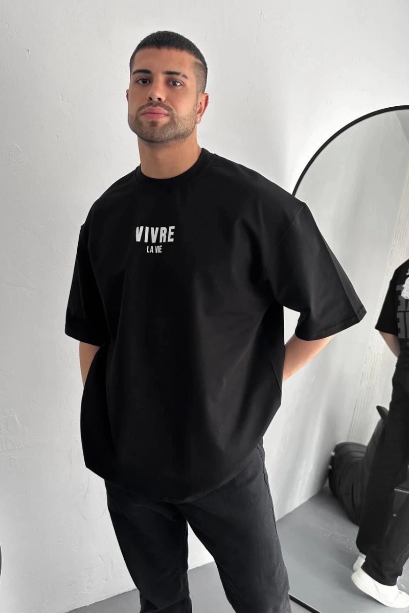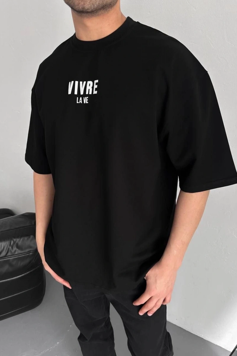 Baskılı Oversize Bisiklet Yaka T-shirt - Siyah