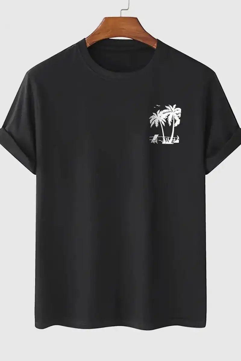 20/1 Penye Compack Palmiye Baskılı Oversize Bisiklet Yaka Kısa Kol T-shirt - Siyah
