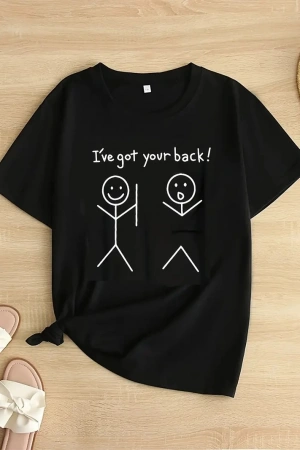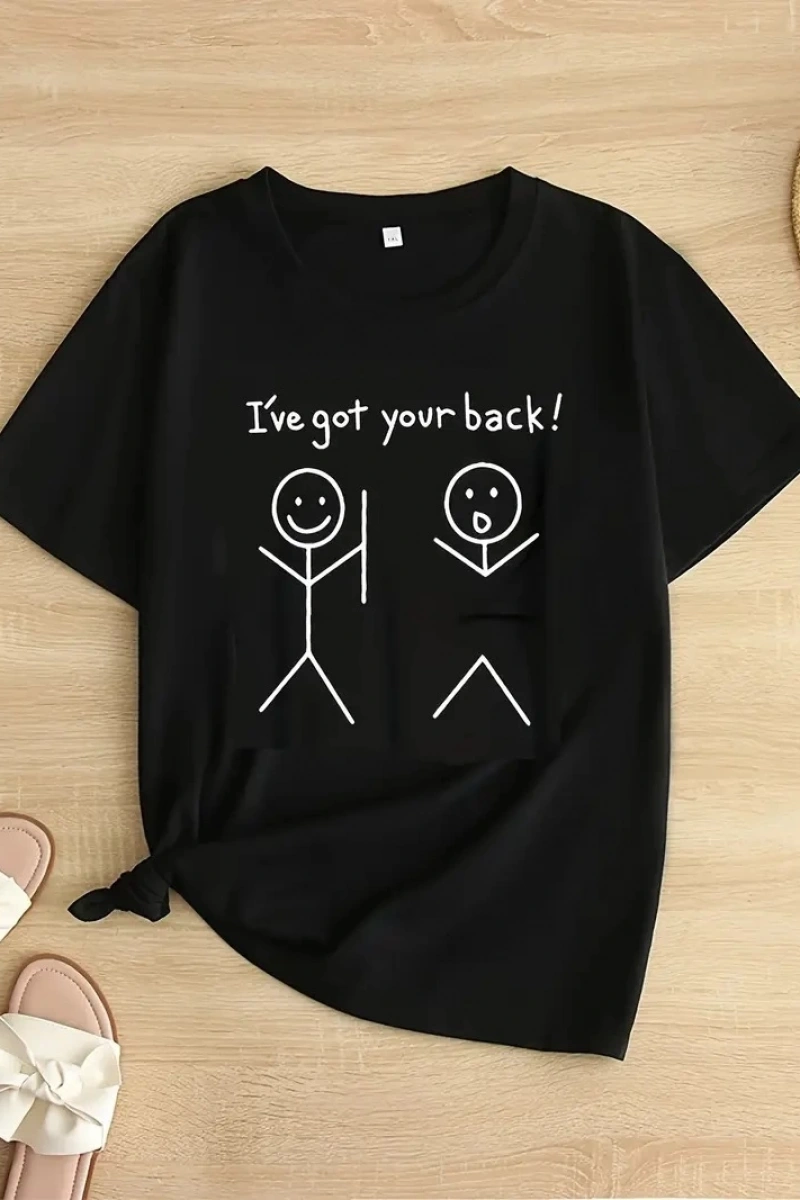 Kadın Beyaz "I've Got Your Back" Grafik Tişört - Eğlenceli Çubuk Tasarımlı Oversize Günlük Kısa Kollu Tişört, Polyester Örgü, Yuvarlak Yaka, İlkbahar ve Yaz için Mükemmel, Günlük Giyim Tişört | Eğlenceli Tasarım | Polyester Kumaş- Siyah