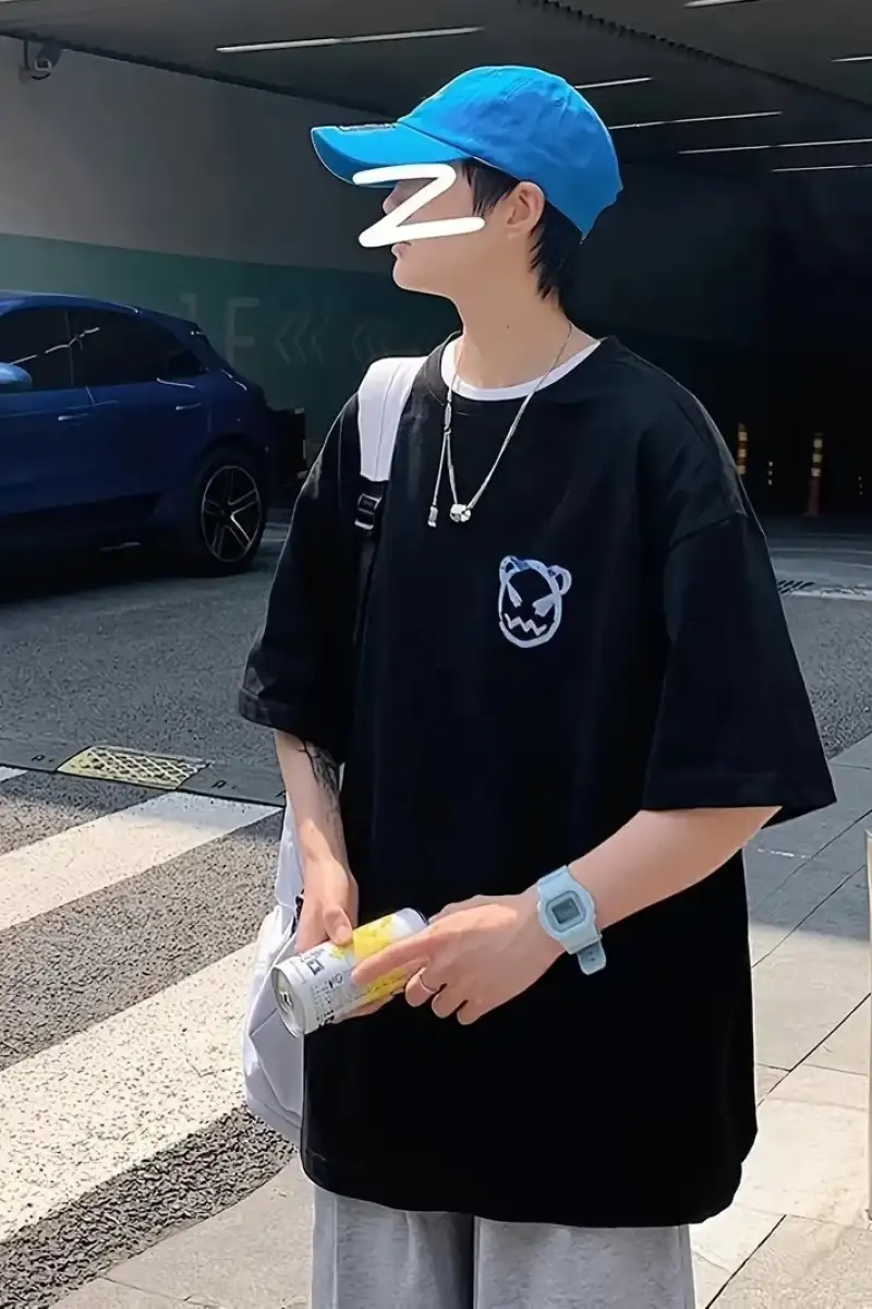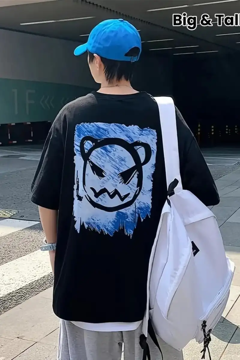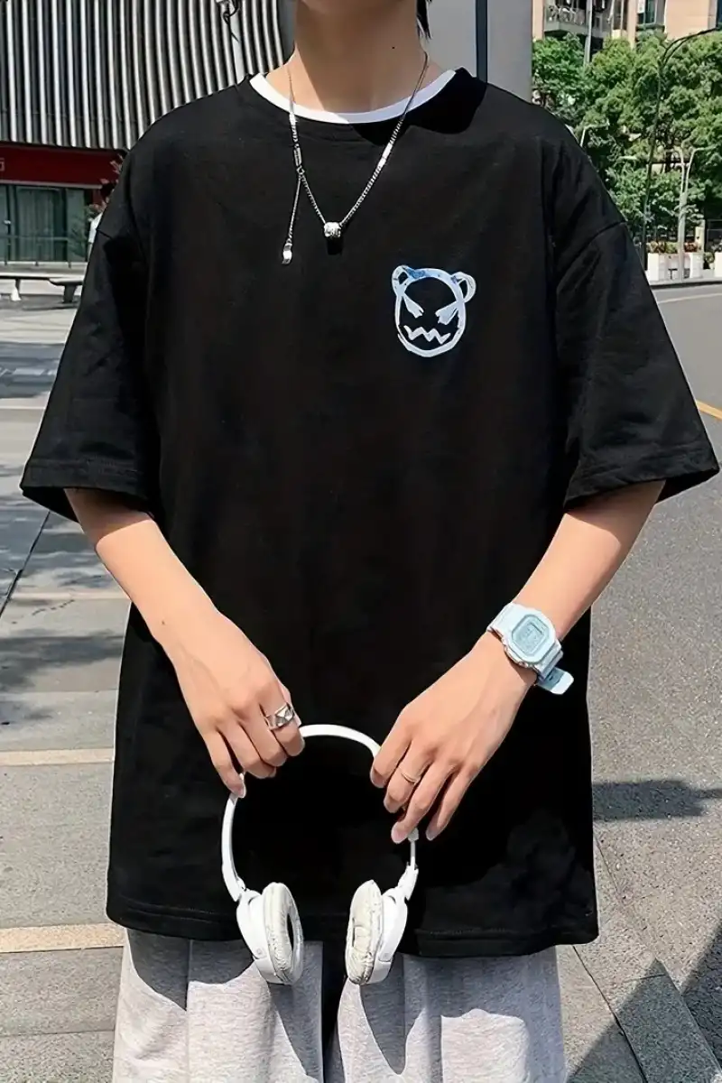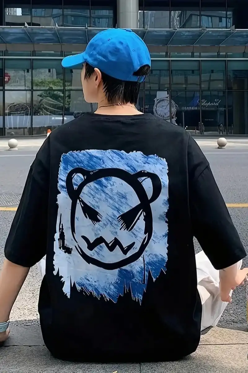 20/1 Penye Compack Bisiklet Yaka Kore tarzı sevimli ayı baskı Kısa Kol Erkek t-shirt - Siyah
