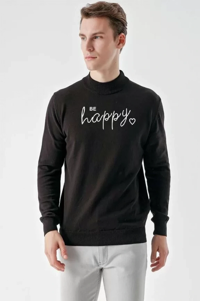 Baskılı Uzun Kol Yarım Boğazlı Dokuma Triko - Siyah