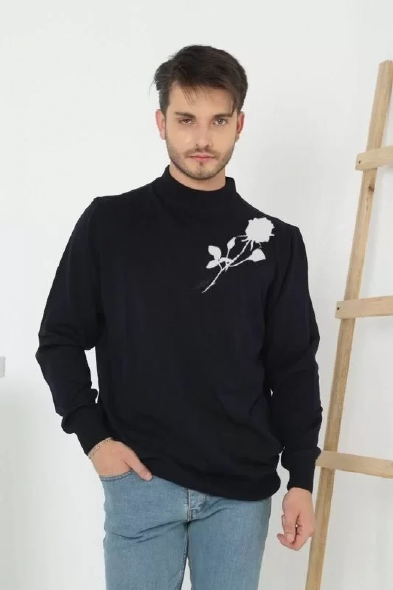 Baskılı Yarım Boğazlı Uzun Kol Dokuma Triko - Siyah