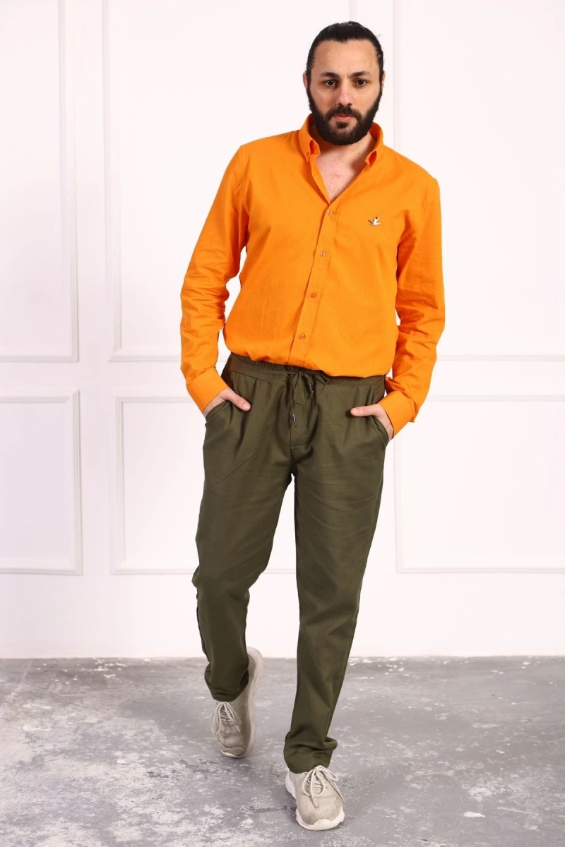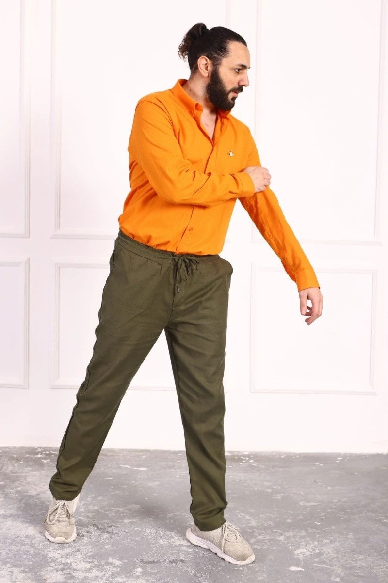 Beli Lastikli Ve Bağcıklı Erkek Keten Pantolon Haki