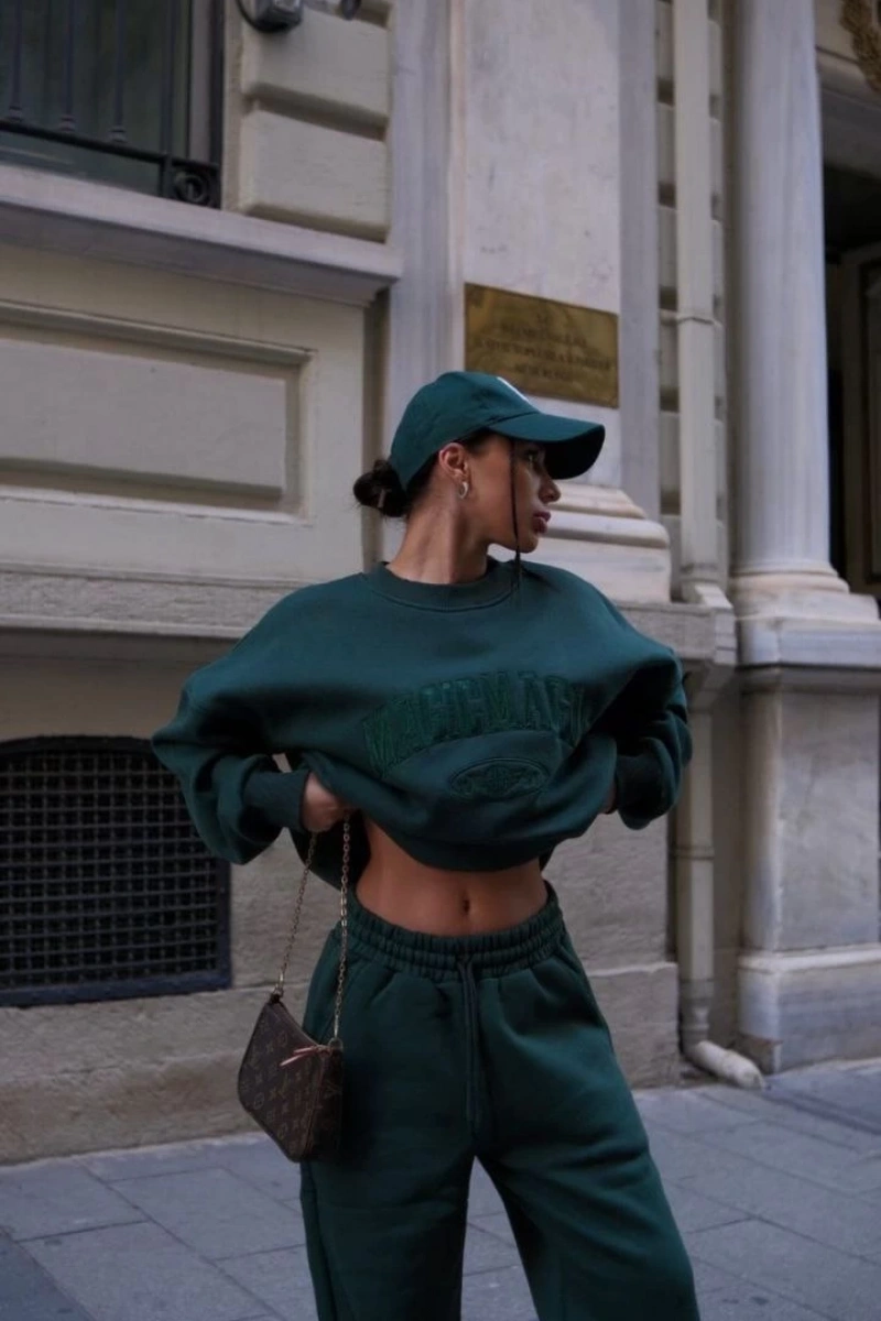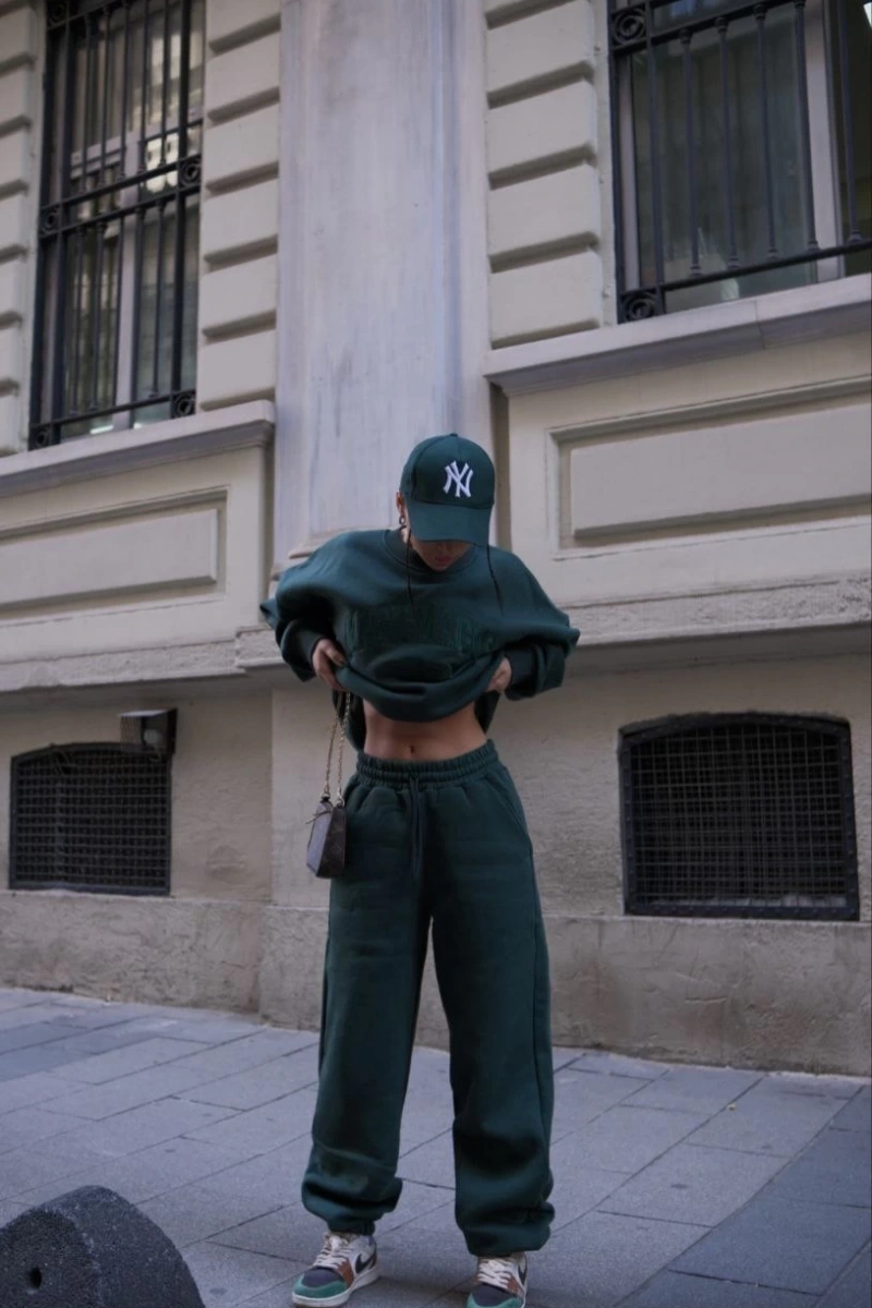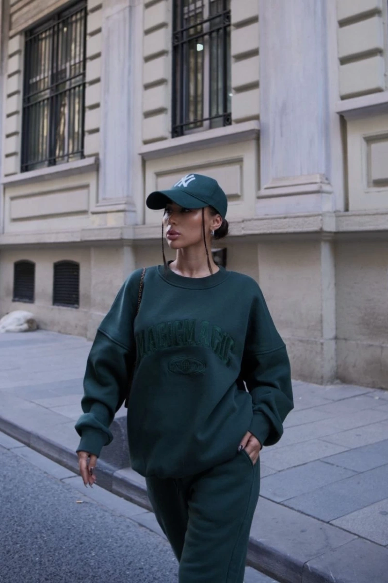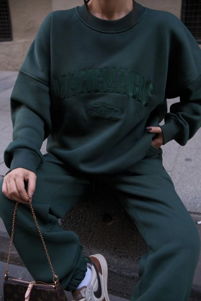 Bisiklet Yaka Nakış İşlemeli Üç İplik Sweat Takım - Yeşil