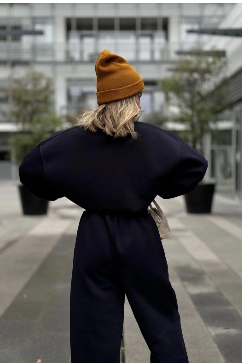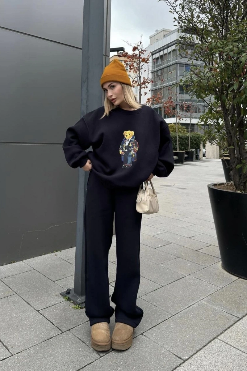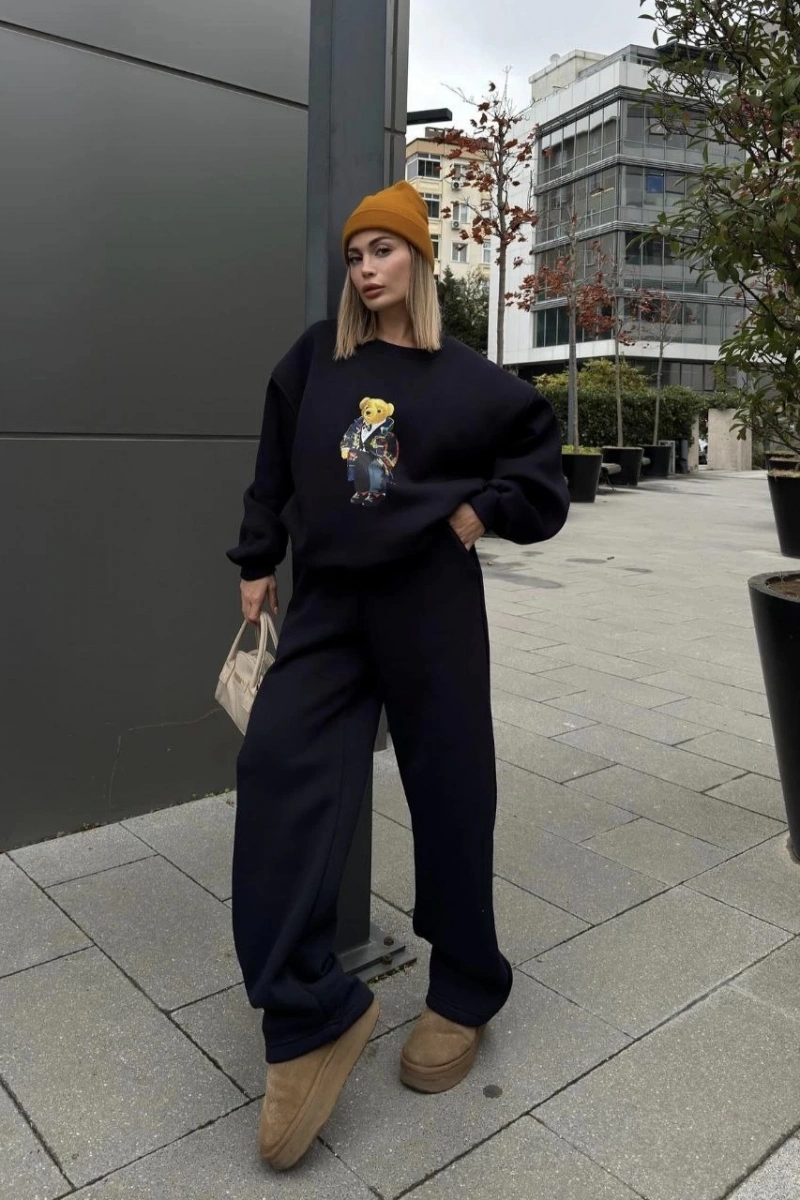 Bisiklet Yaka Üç İplik Sweat Takım - Siyah