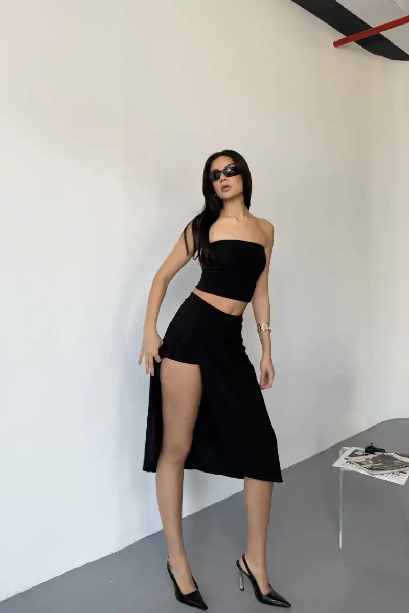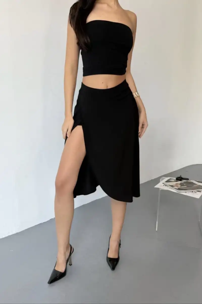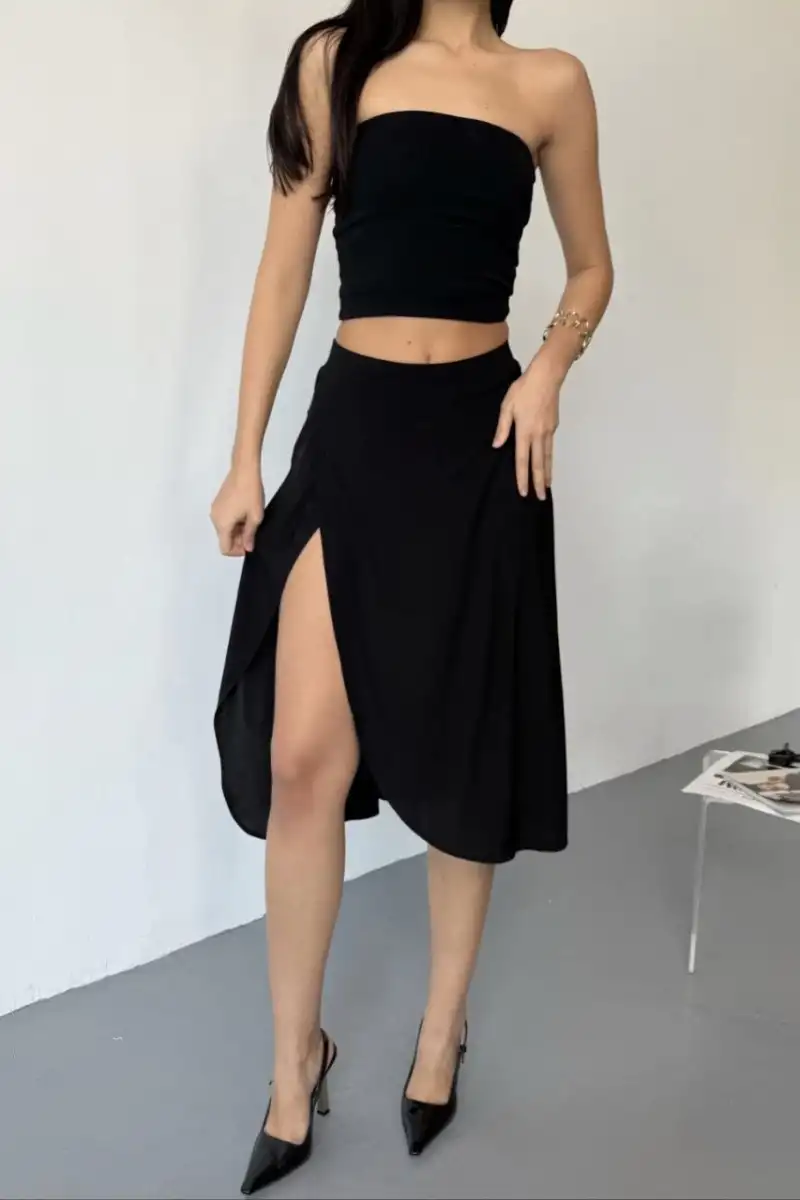 Cepli Şortlu Yırtmaçlı Etek - Siyah