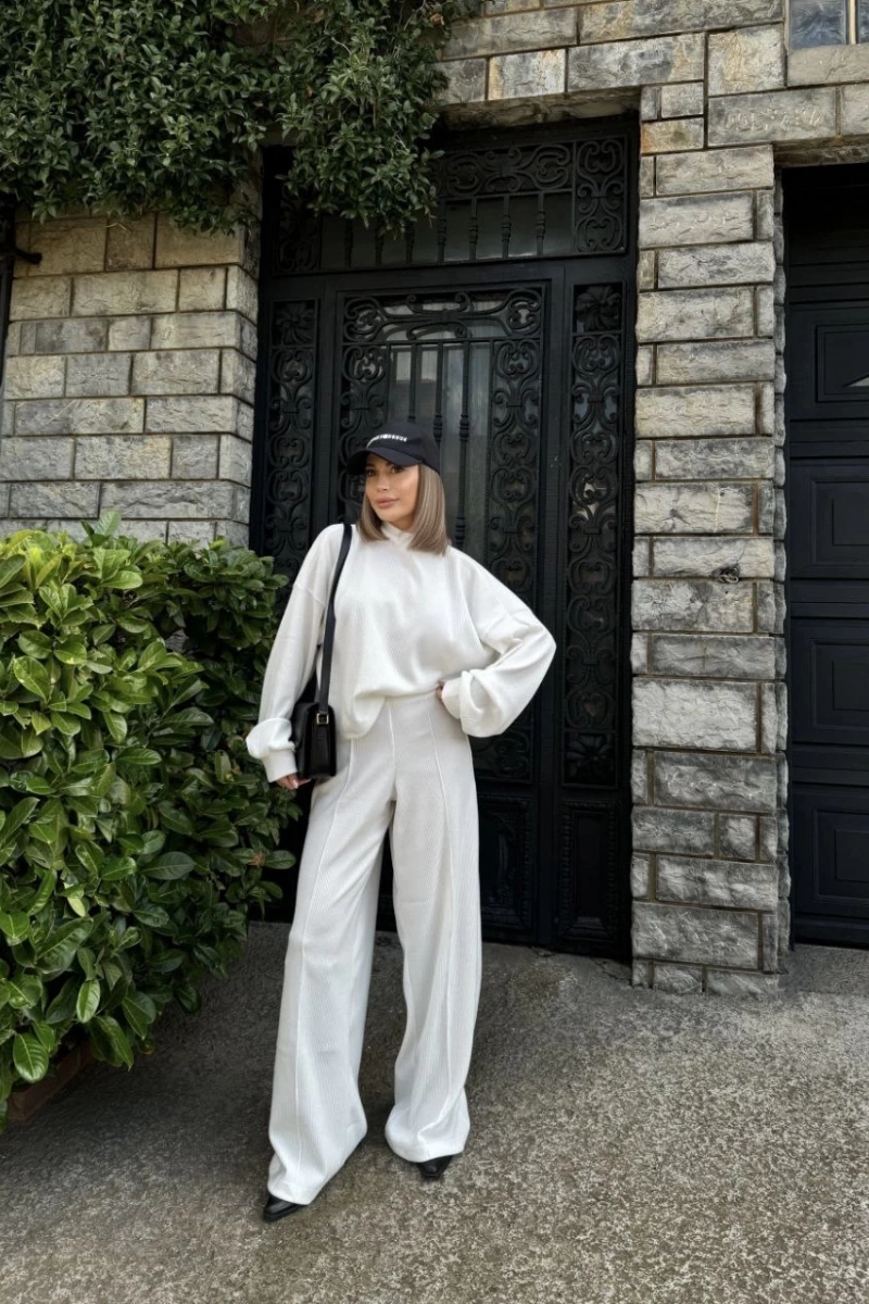Crop, Pantolon Fitilli İkili Takım -Beyaz