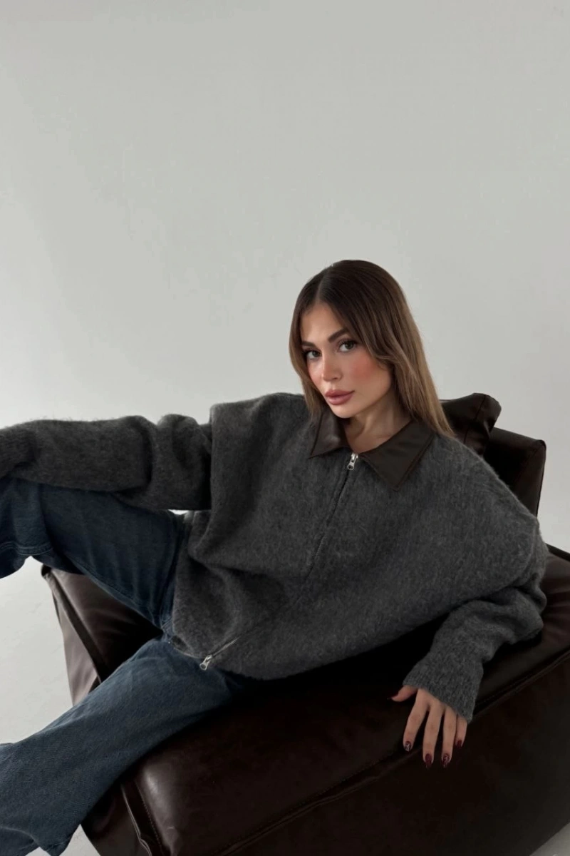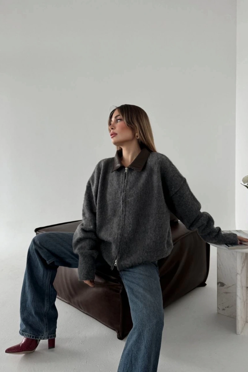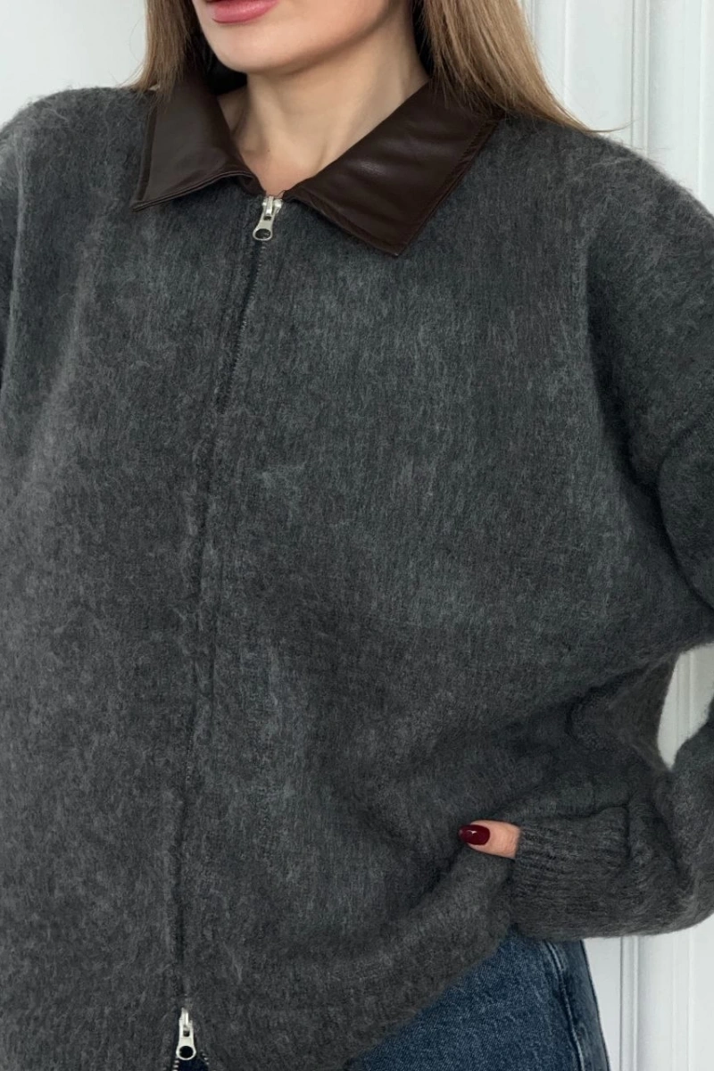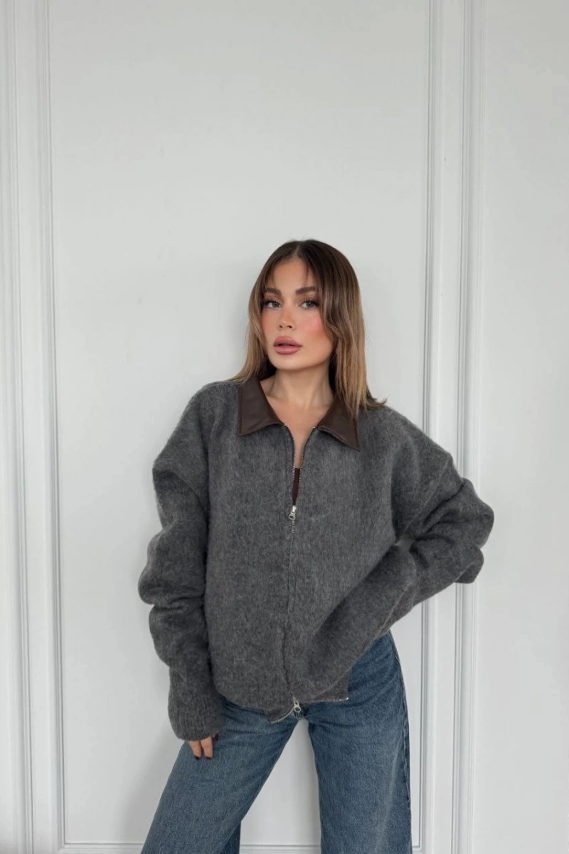 Deri Yakalı Pamuk dokulu Çift Taraflı Çalışan Fermuar Ceket - Füme