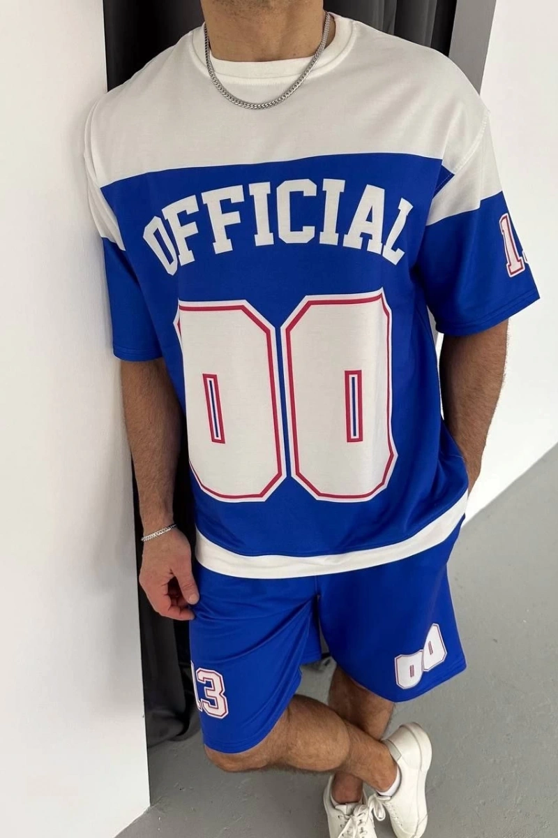 Erkek Şortlu Takım – Oversize İki İplik Kumaş, Ön & Arka Dijital Baskılı Tişört ve Lastikli Cepli Şort, Yazlık Günlük Spor Set - Mavi