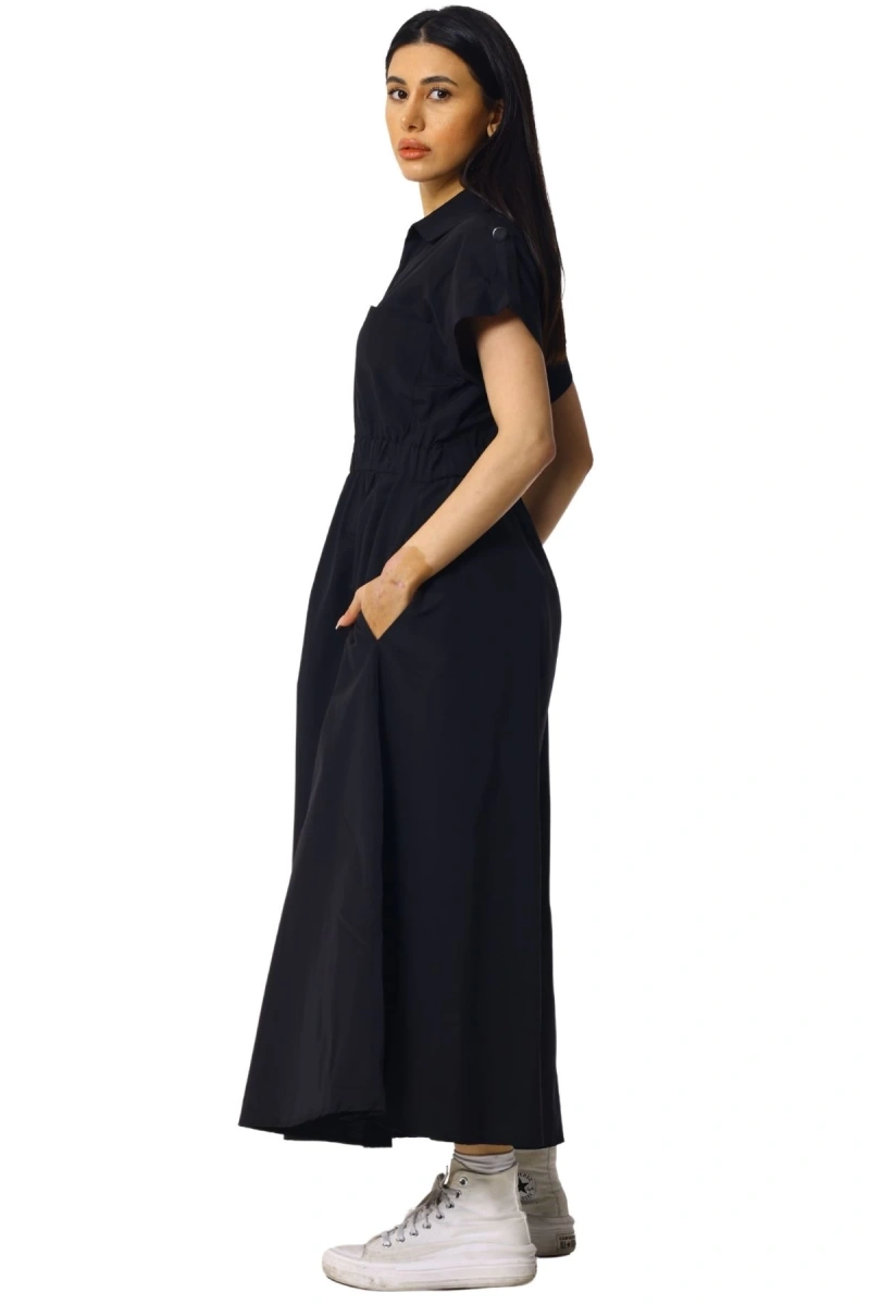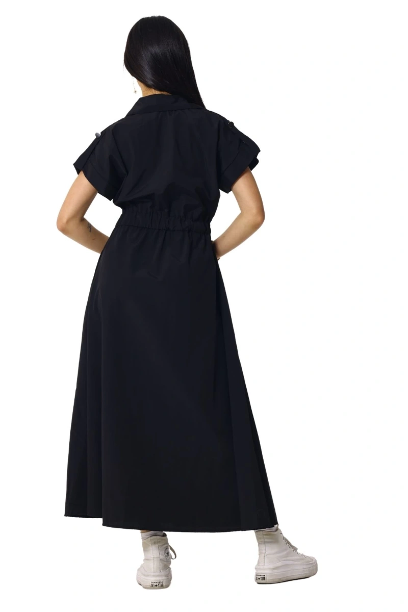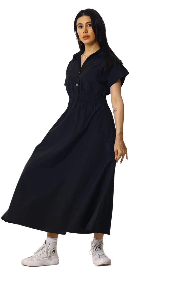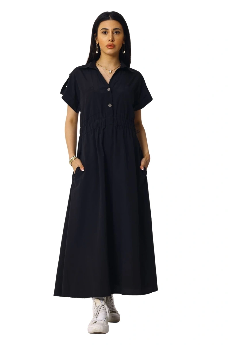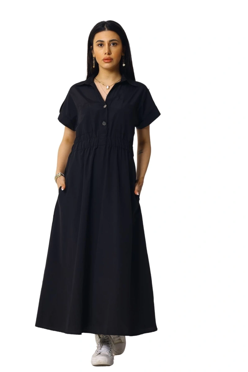 Şıklığı ve rahatlığı bir arada sunan Düğmeli Gömlek Yakalı Elbise Siyah, gardırobunuzun vazgeçilmezi olmaya aday.