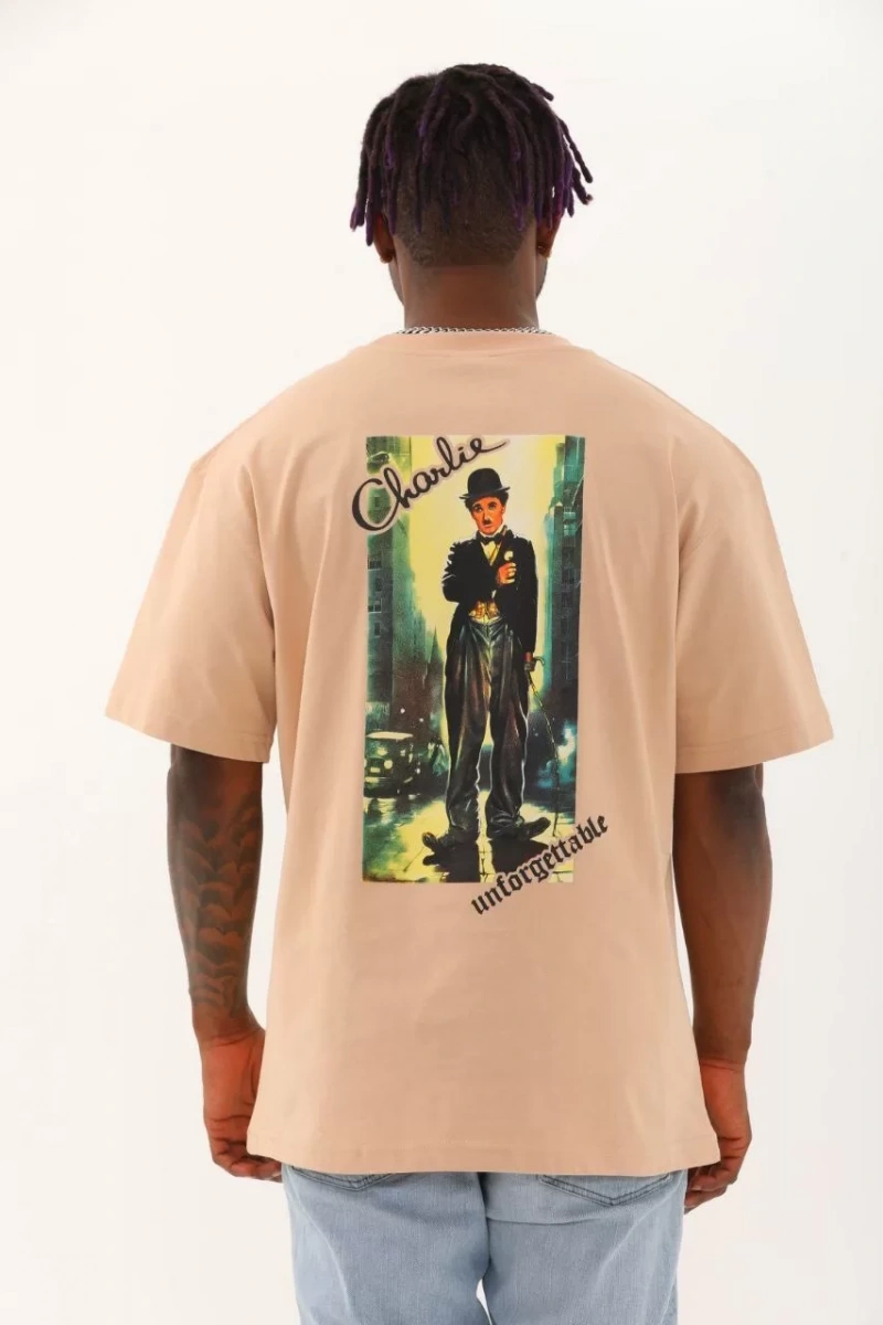 Unisex Oversize Baskılı Bisiklet Yaka T-Shirt - Bej