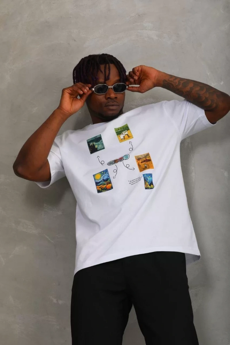 Unisex Oversize Baskılı Bisiklet Yaka T-Shirt - Beyaz