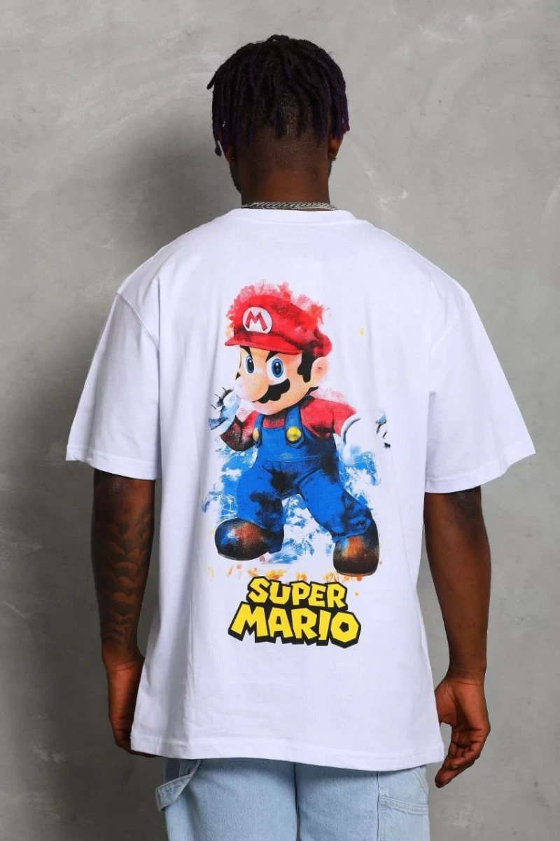 Unisex Oversize Baskılı Bisiklet Yaka T-Shirt - Beyaz