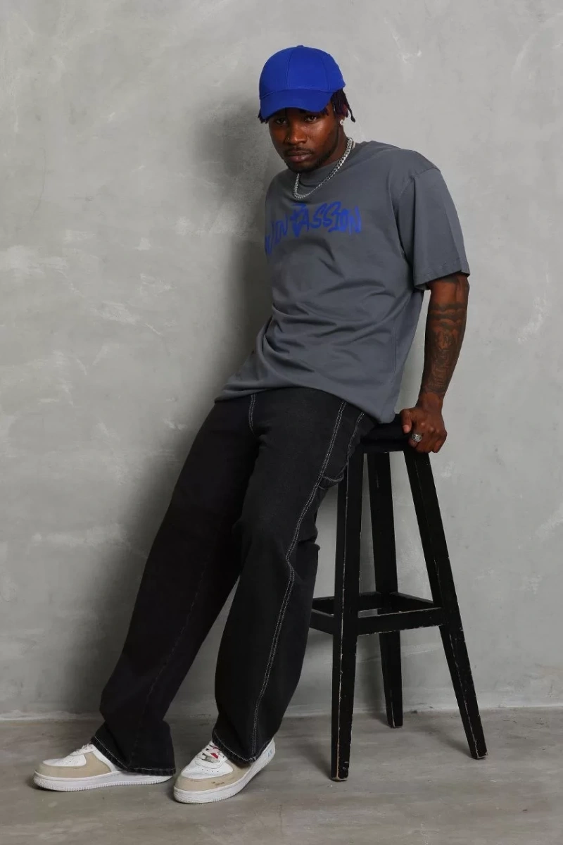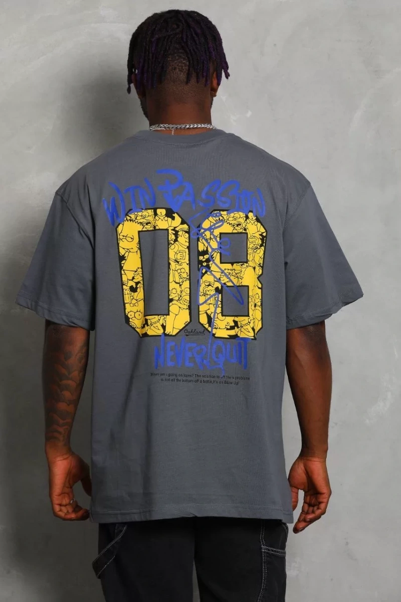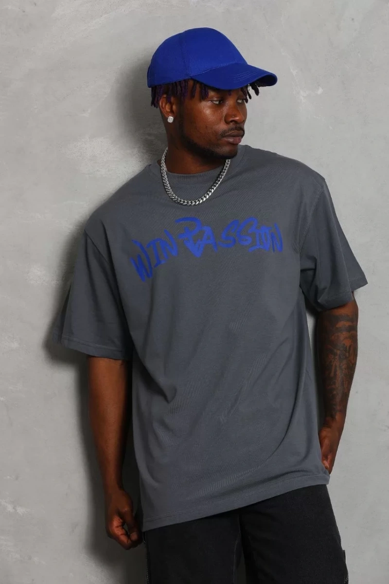 Unisex Oversize Baskılı Bisiklet Yaka T-Shirt - Füme