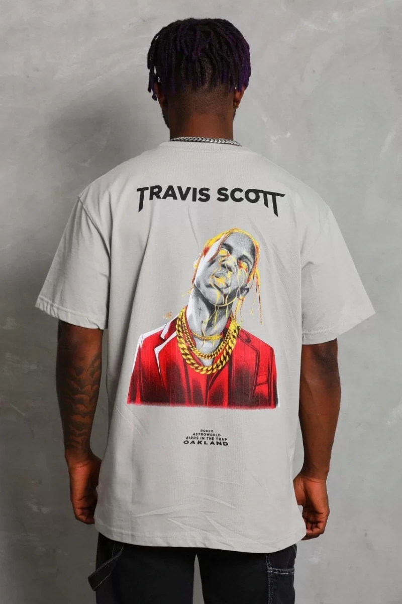 Unisex Oversize Baskılı Bisiklet Yaka T-Shirt - Gri
