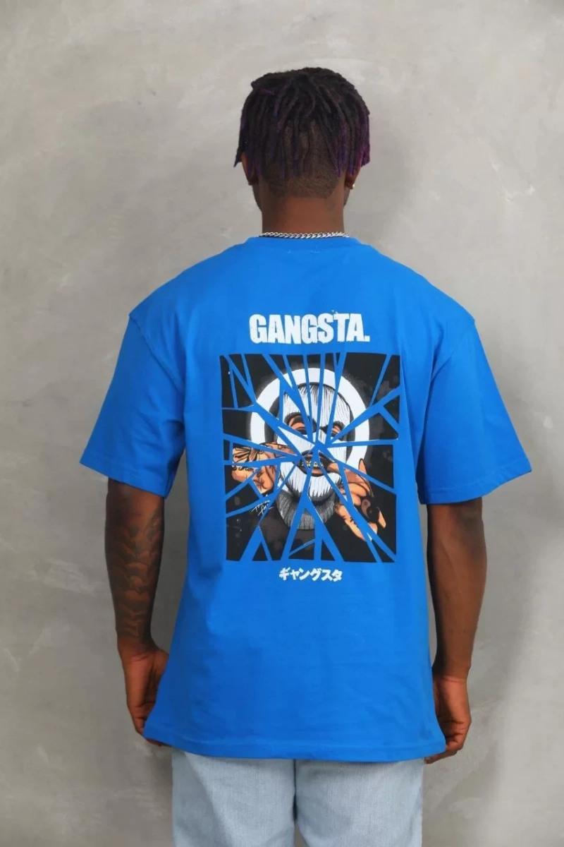 Unisex Oversize Baskılı Bisiklet Yaka T-Shirt - Mavi