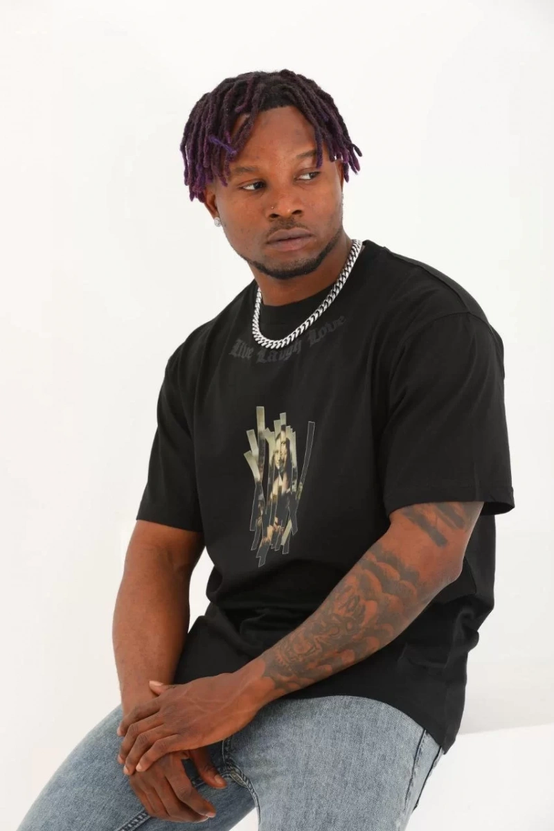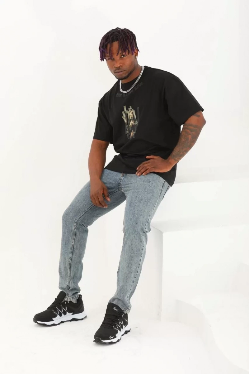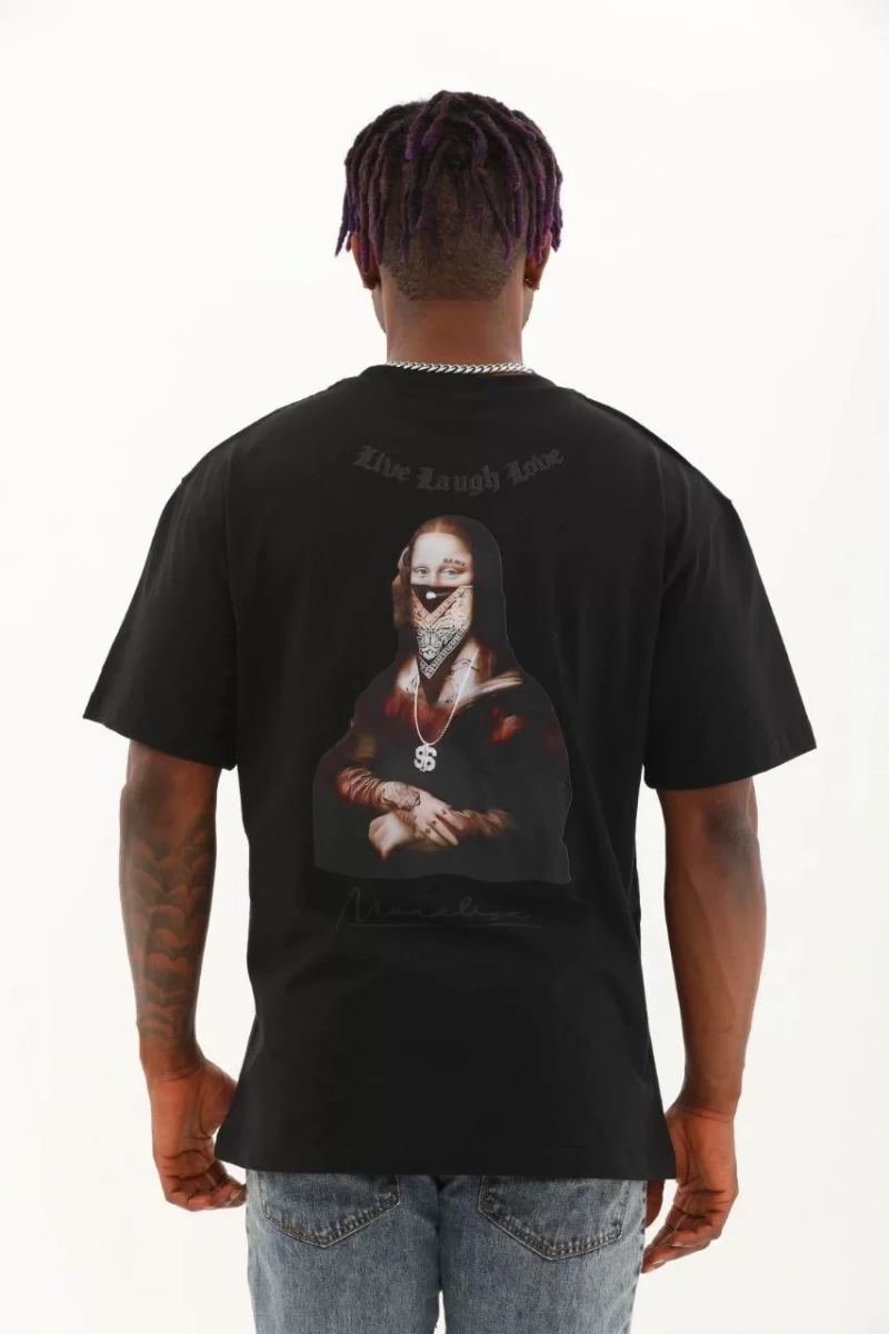 Unisex Oversize Baskılı Bisiklet Yaka T-Shirt - Siyah