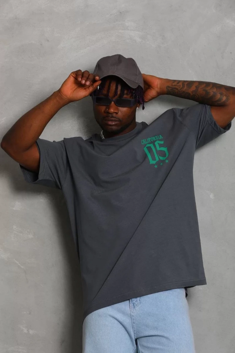 Unisex Oversize Baskılı Bisiklet Yaka T-Shirt - Füme