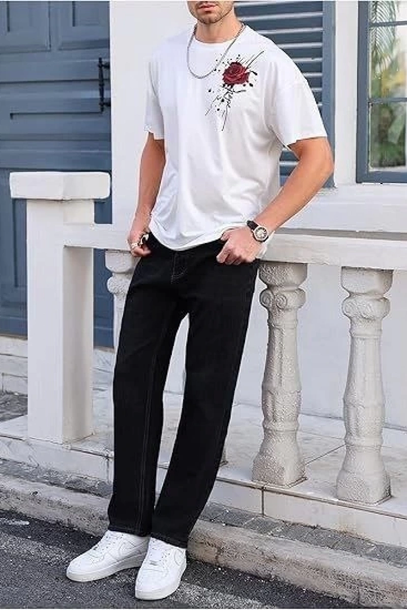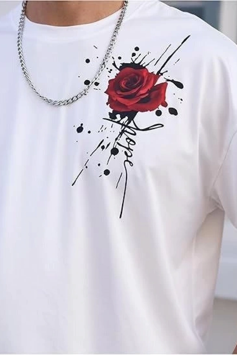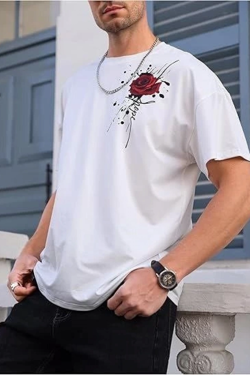Erkek Bisiklet Yaka Kısa Kol Baskılı T-shirt - Beyaz