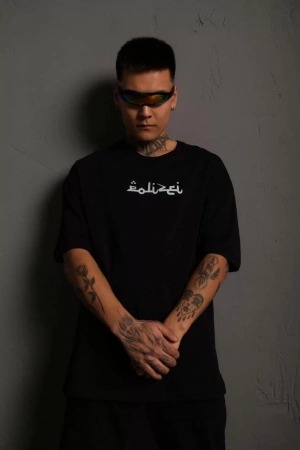 Erkek Bisiklet Yakalı Sırt Baskılı Oversize T-Shirt - Siyah
