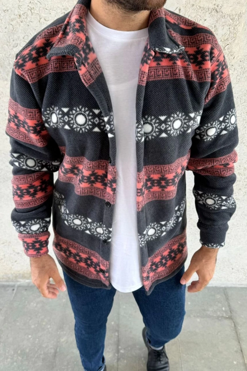 Erkek Desenli Polar Gömlek – Etnik Şerit Desen Yakalı, Uzun Kollu, Düğmeli, Oversize Rahat Kalıp - Füme