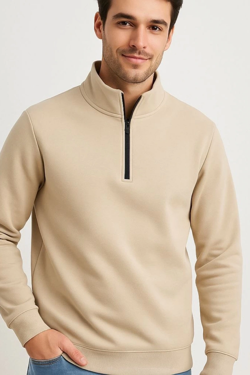 Erkek Dik Yaka Sweatshirt Dik Yaka Yarım Fermuarlı 3 İplik Şardonlu Pamuk Kumaş - Bej