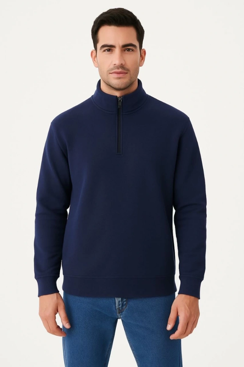 Erkek Dik Yaka Sweatshirt Dik Yaka Yarım Fermuarlı 3 İplik Şardonlu Pamuk Kumaş - Lacivert