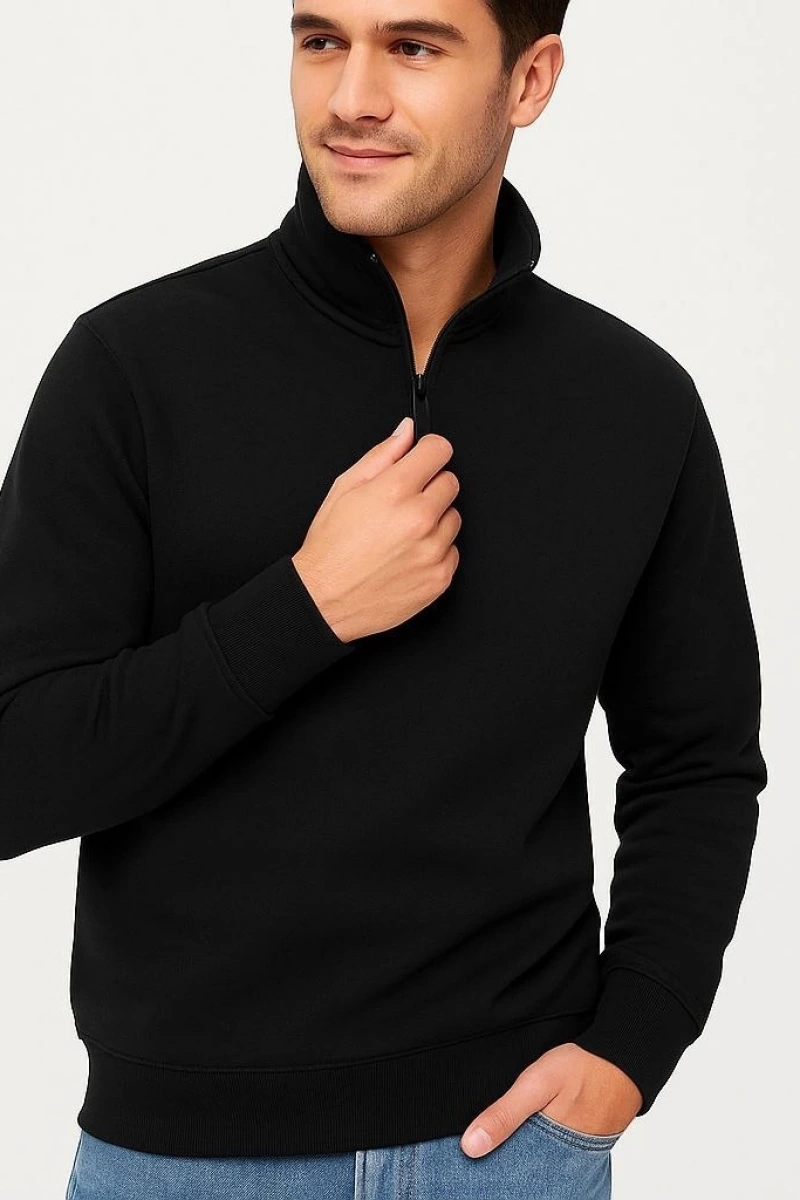 Erkek Dik Yaka Sweatshirt Dik Yaka Yarım Fermuarlı 3 İplik Şardonlu Pamuk Kumaş - Siyah