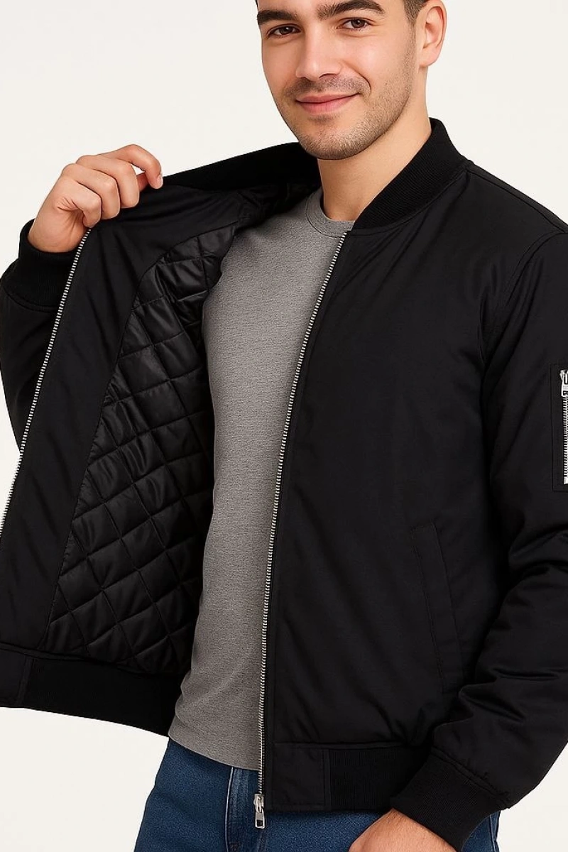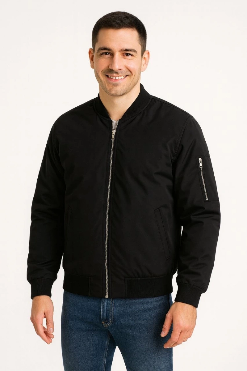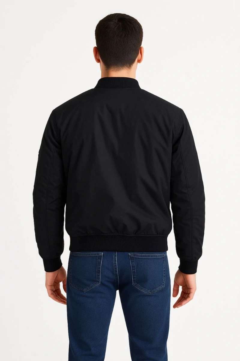 Erkek Bomber Mont Ceket – Fermuarlı, Kapitone İçi Astarlı, Su İtici Kumaş, Regular Fit, Uzun Kollu, Yandan Cepli, Bahar & Kış Rahat Günlük Stil - Siyah