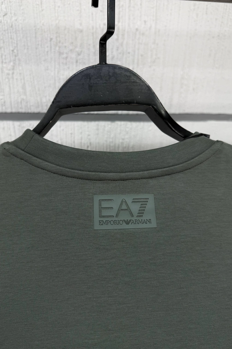 Erkek Kabartma Logolu Likralı Double Face Kumaş Bisiklet Yaka sweatshirt Haki Yeşil
