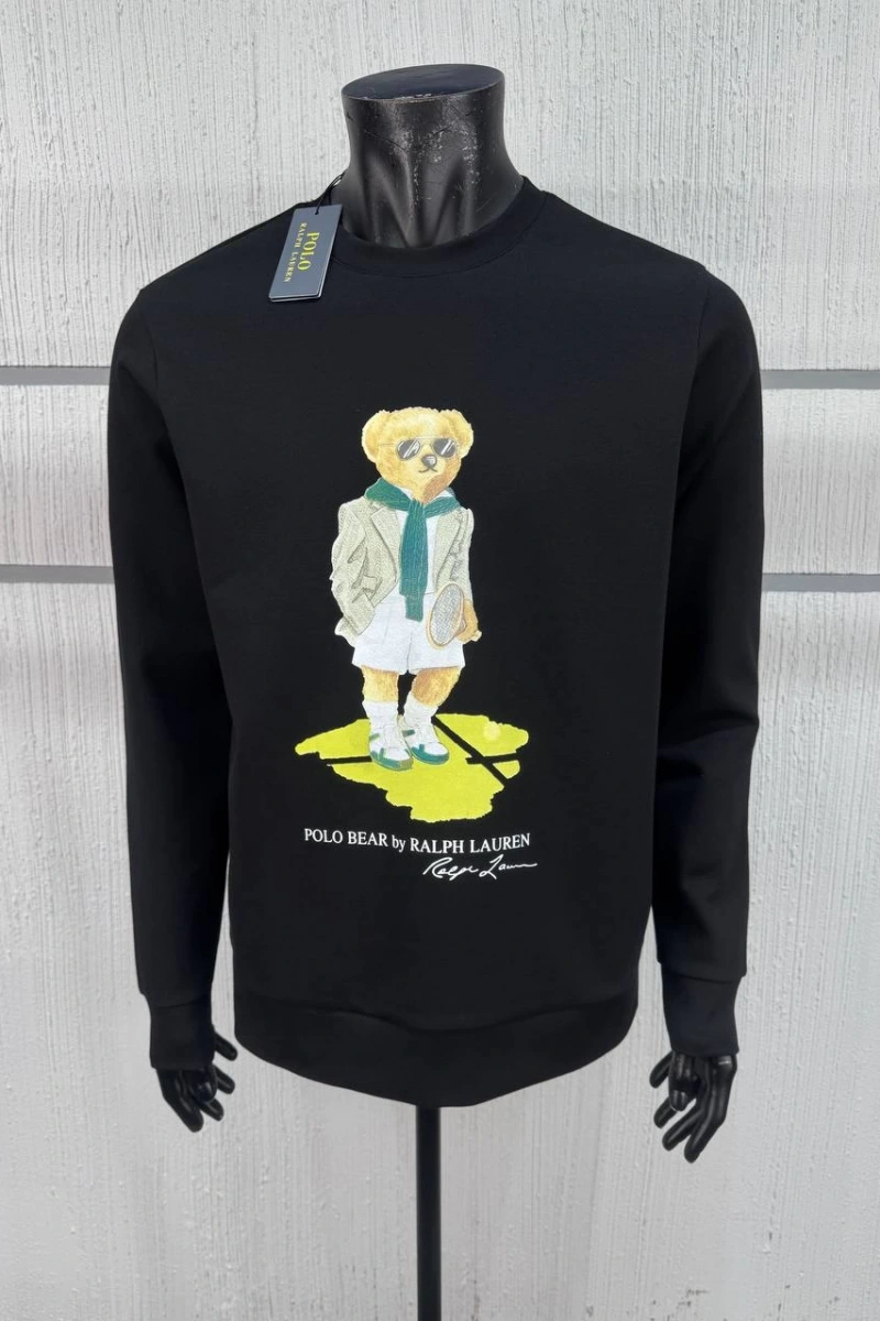 Erkek Likralı 3 İplik Ayı Logolu Bisiklet Yaka Sweatshirt Siyah