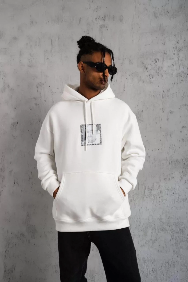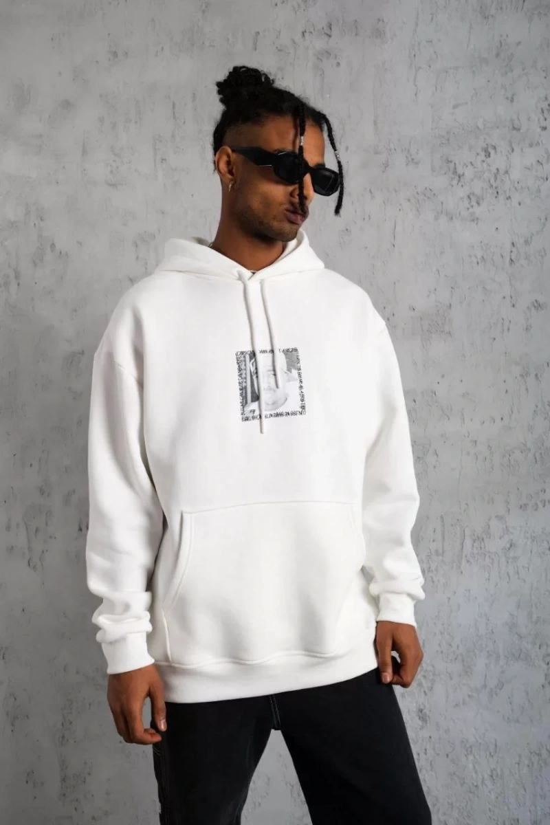 Erkek Ön Arka Baskılı Kapşonlu Sweat - Beyaz