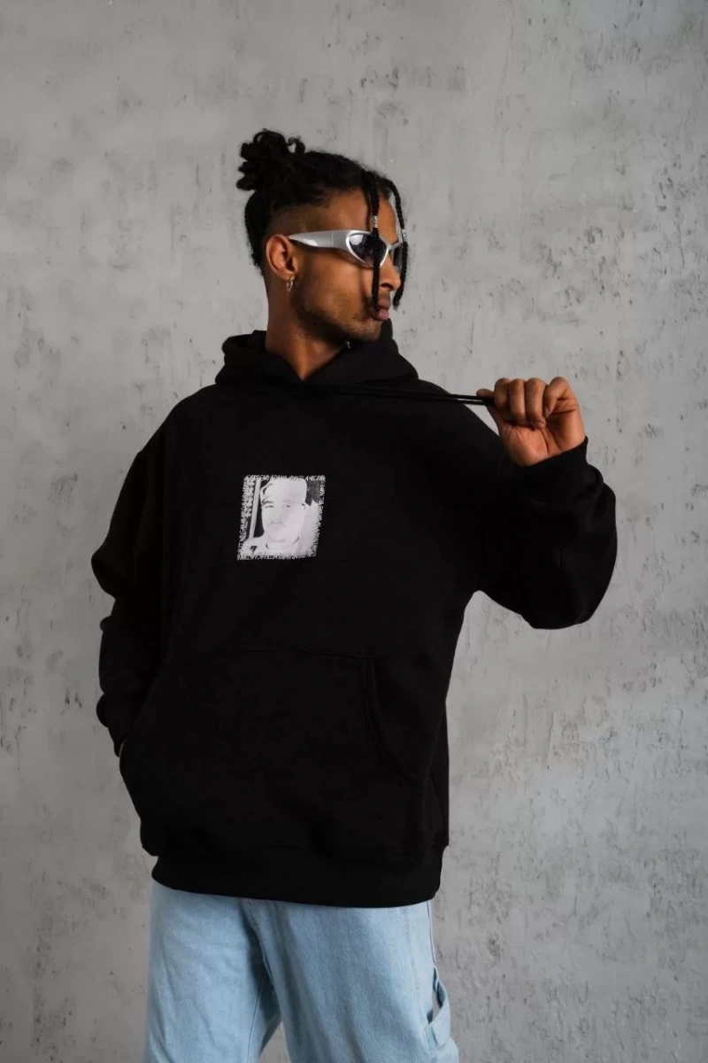 Erkek Ön Arka Baskılı Kapşonlu Sweat - Siyah