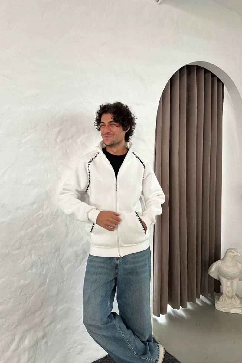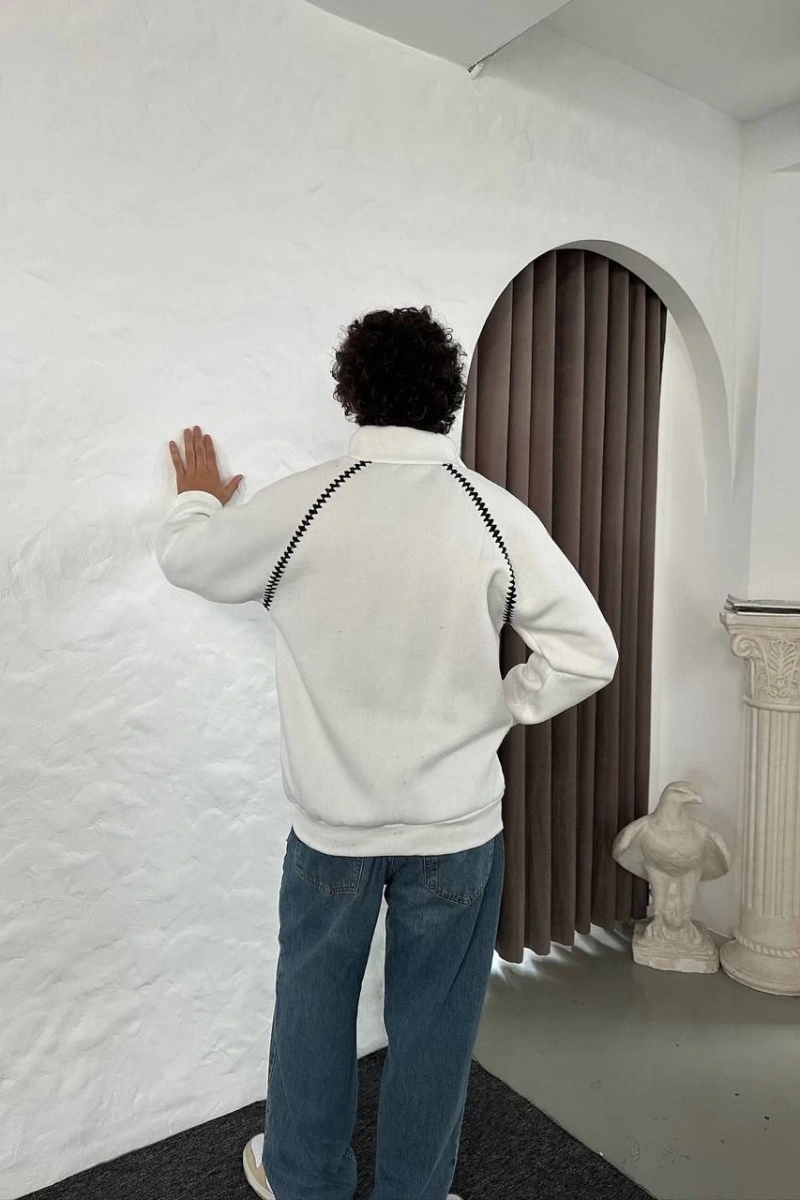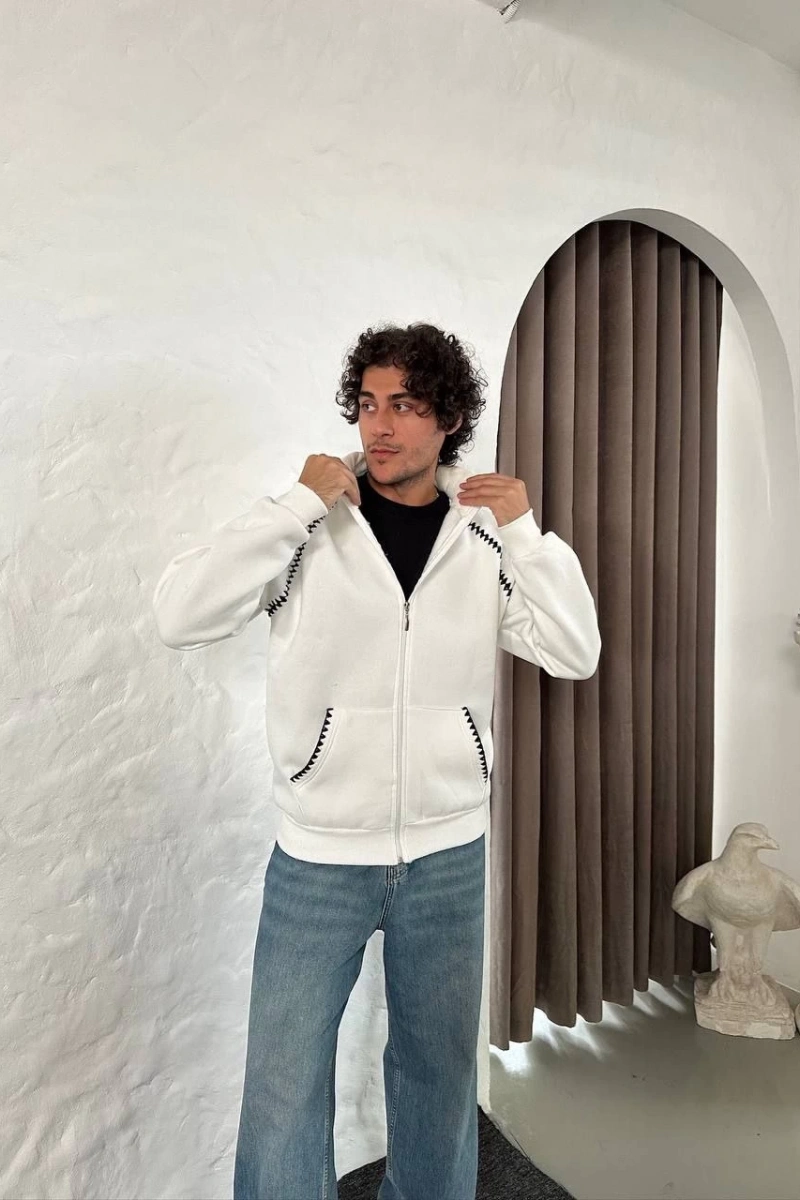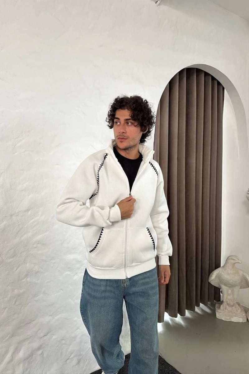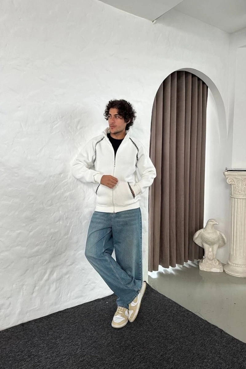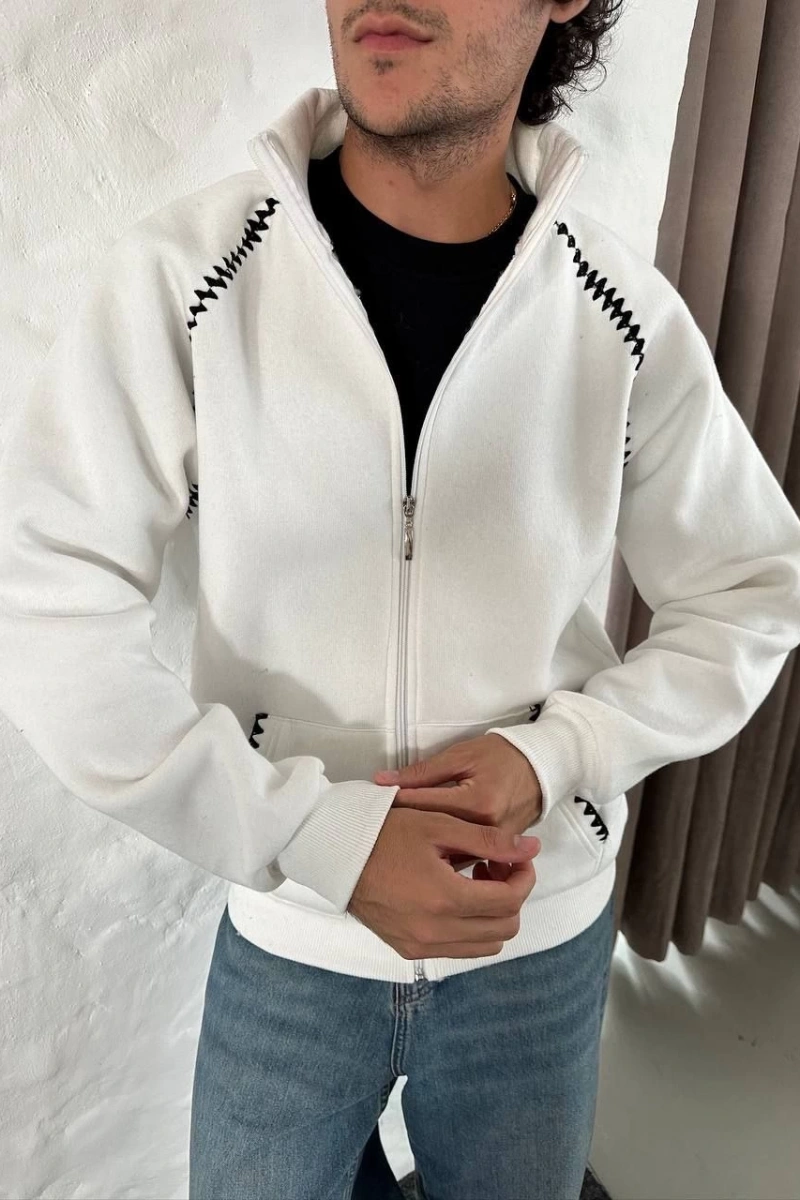 Erkek Oversize Dik Yaka Fermuarlı Sweatshirt - Zincir Nakışli Kanguru Cepli - Beyaz