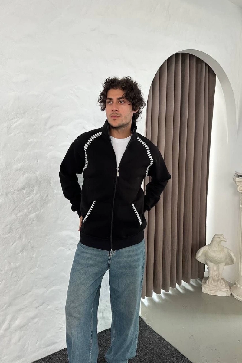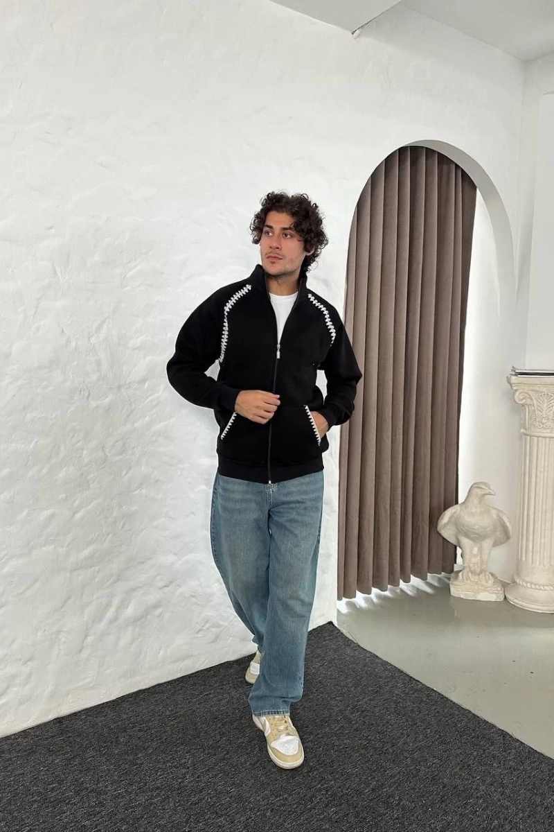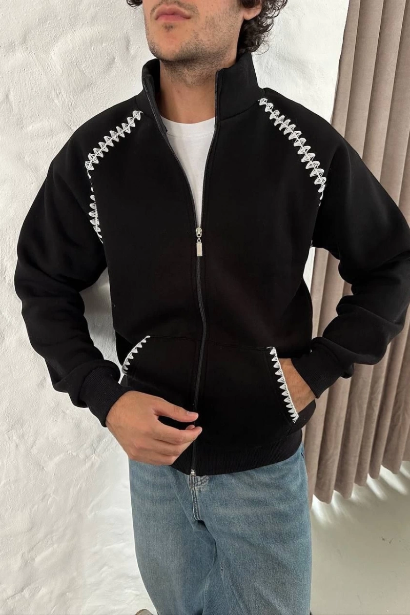 Erkek Oversize Dik Yaka Fermuarlı Sweatshirt - Zincir Nakışli Kanguru Cepli - Siyah