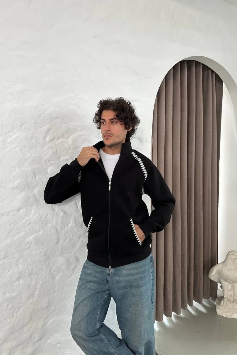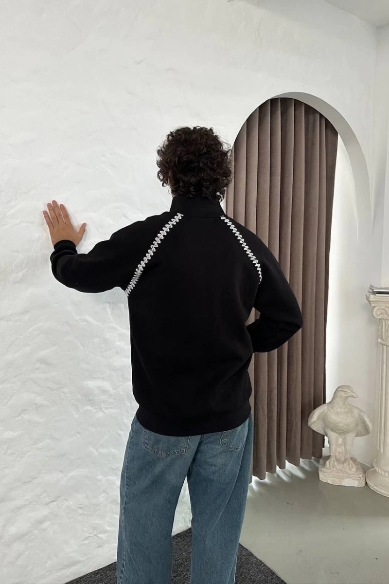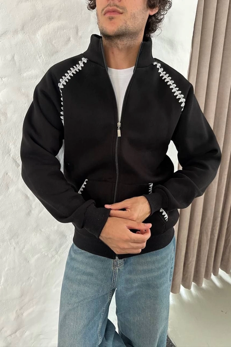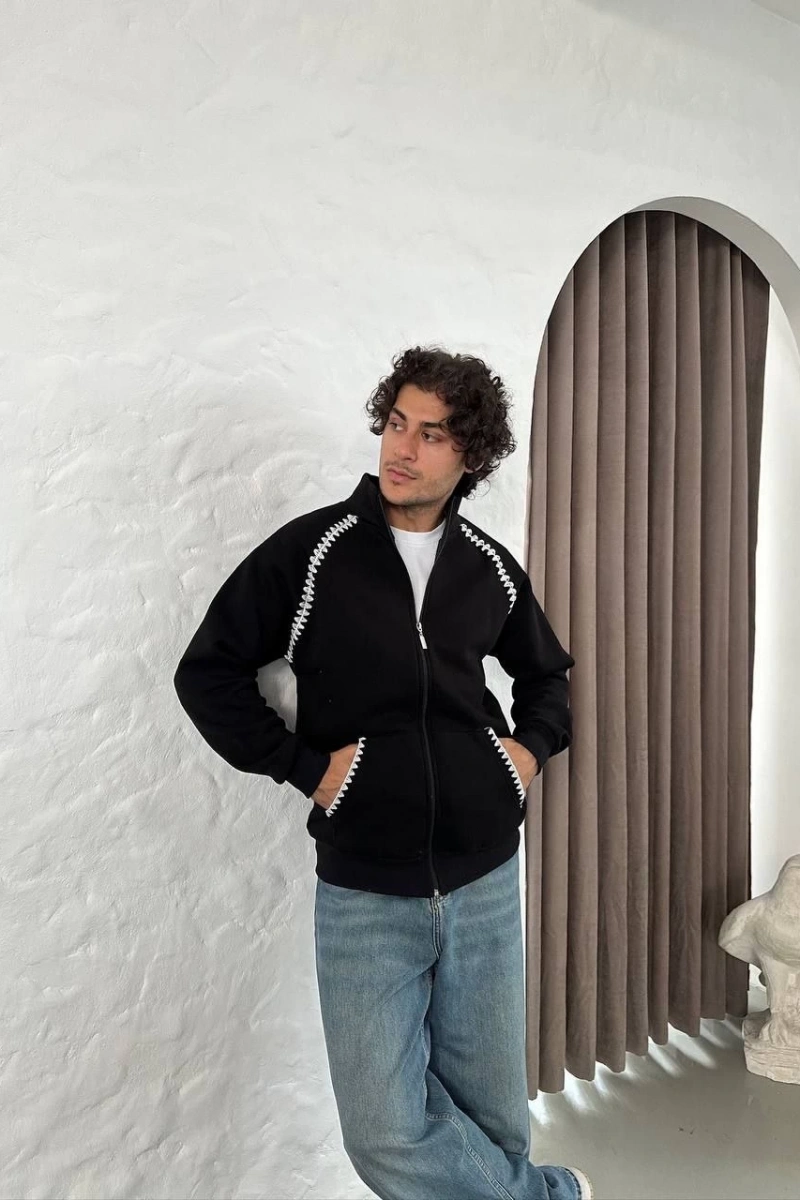 Erkek Oversize Dik Yaka Fermuarlı Sweatshirt - Zincir Nakışli Kanguru Cepli - Siyah