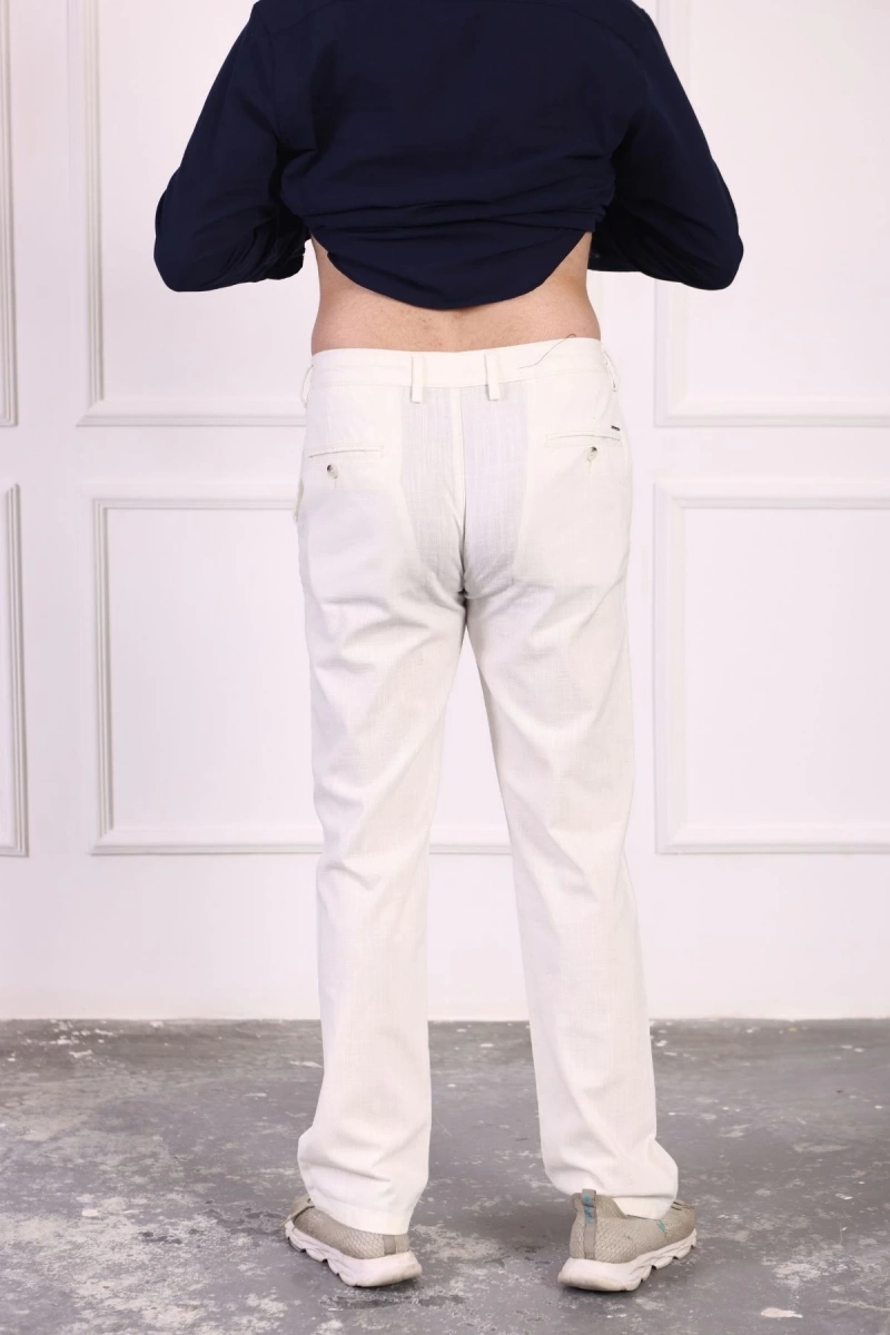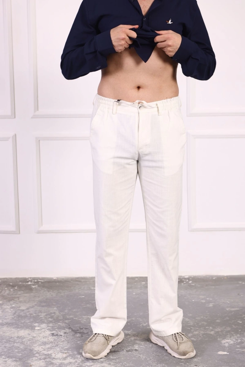 Erkek Pamuklu Keten Rahat Kesim Terletmez Kumaş Bağcıklı Pantolon Beyaz