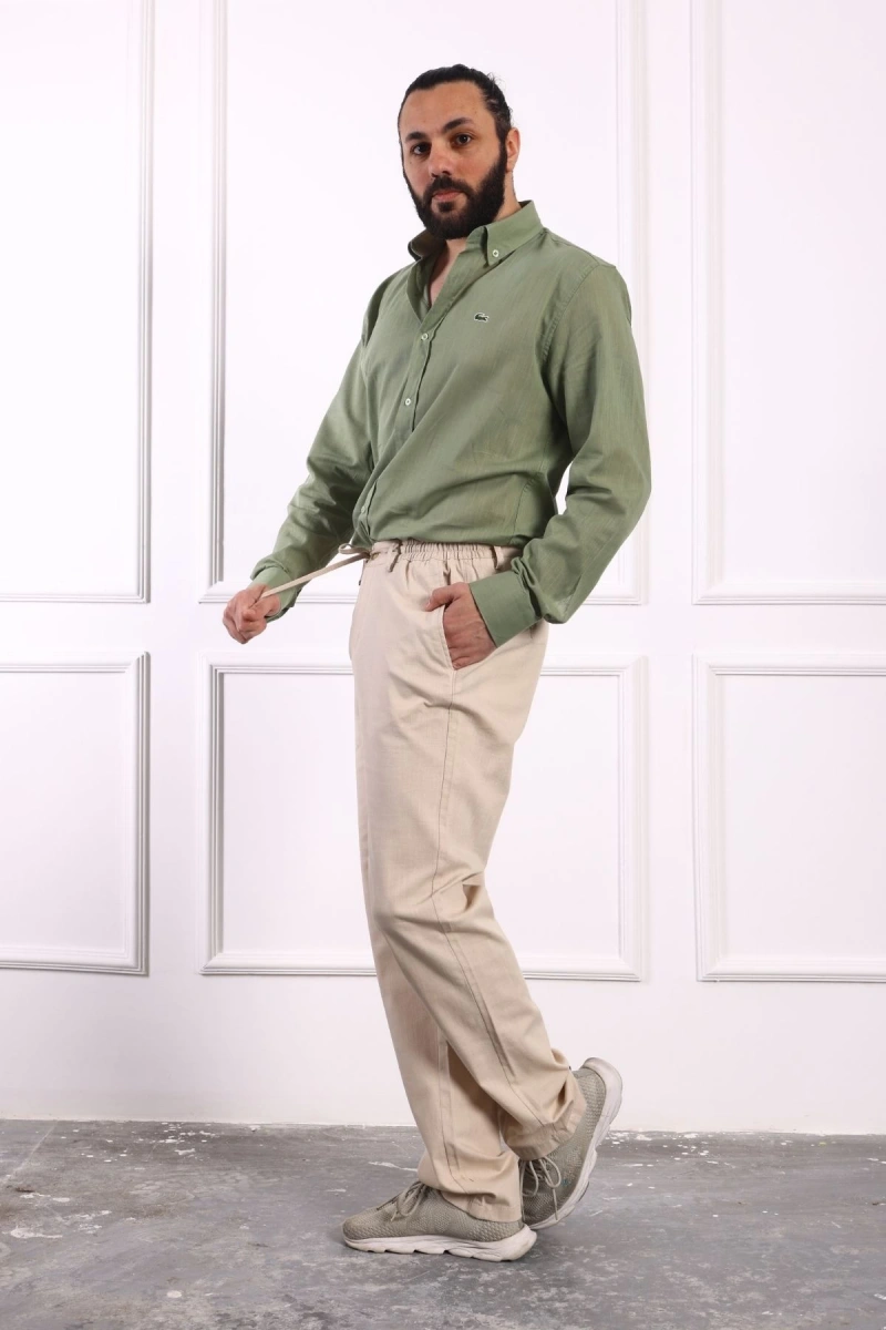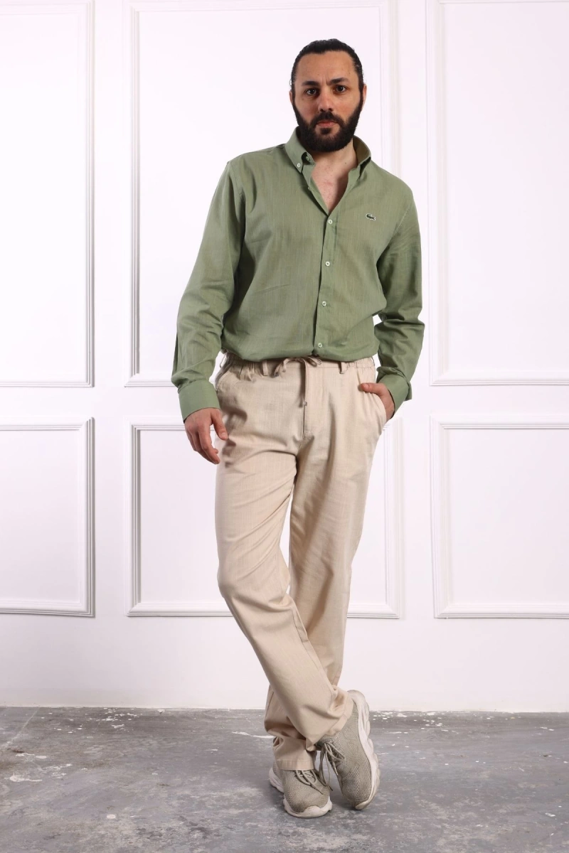 Erkek Pamuklu Keten Rahat Kesim Terletmez Kumaş Bağcıklı Pantolon, hem şık hem de rahat bir seçenek arayan erkekler için ideal bir tercihtir.