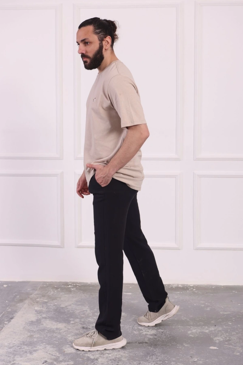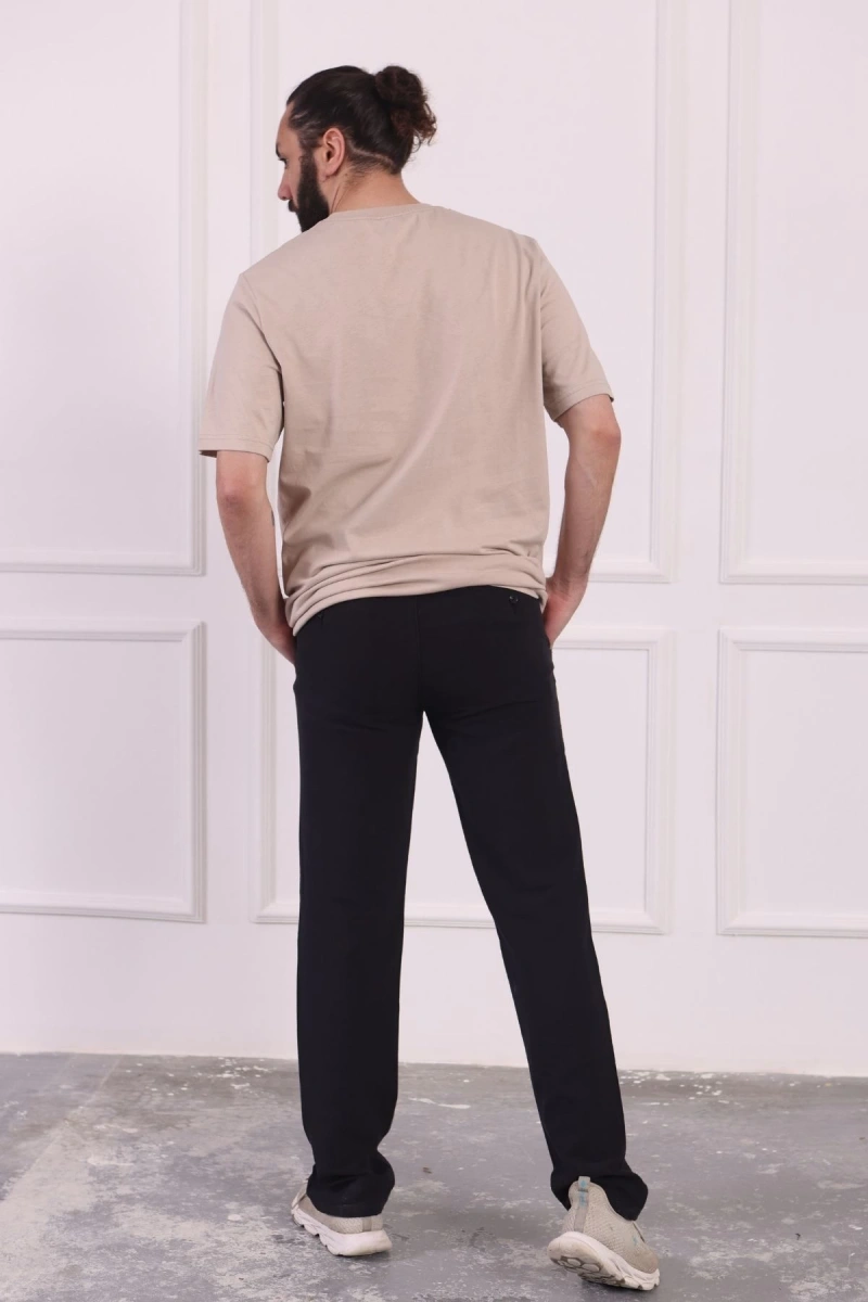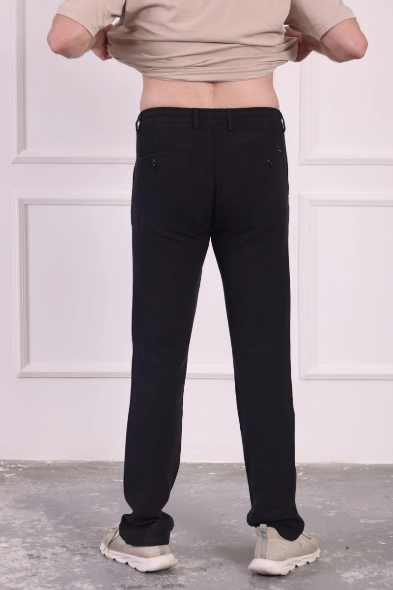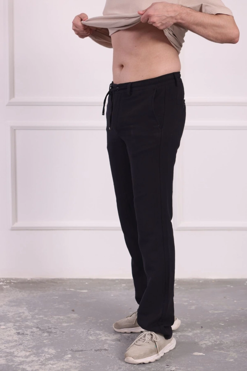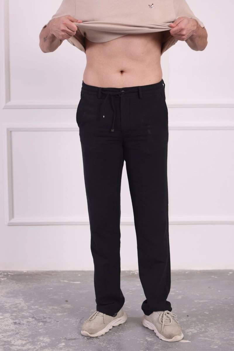 Erkek Pamuklu Keten Rahat Kesim Terletmez Kumaş Bağcıklı Pantolon Siyah