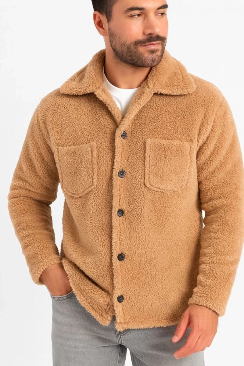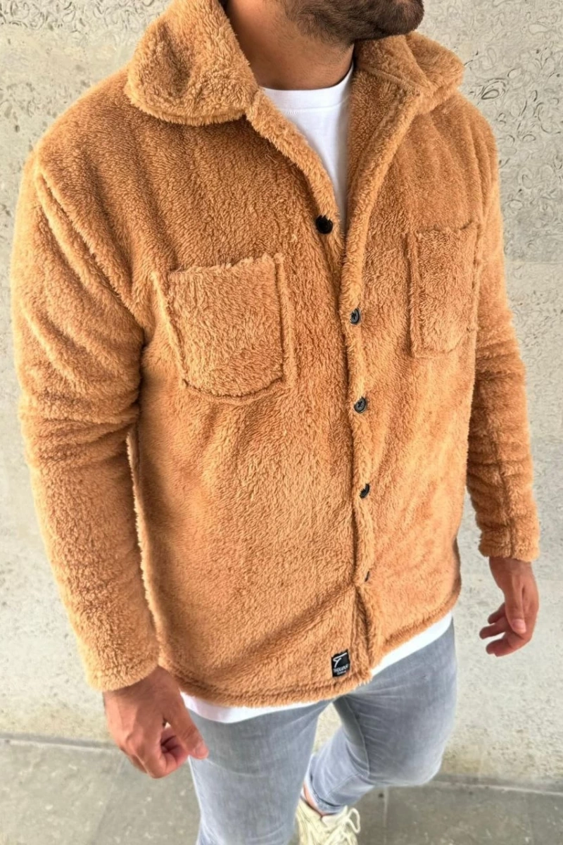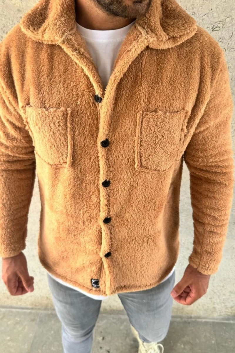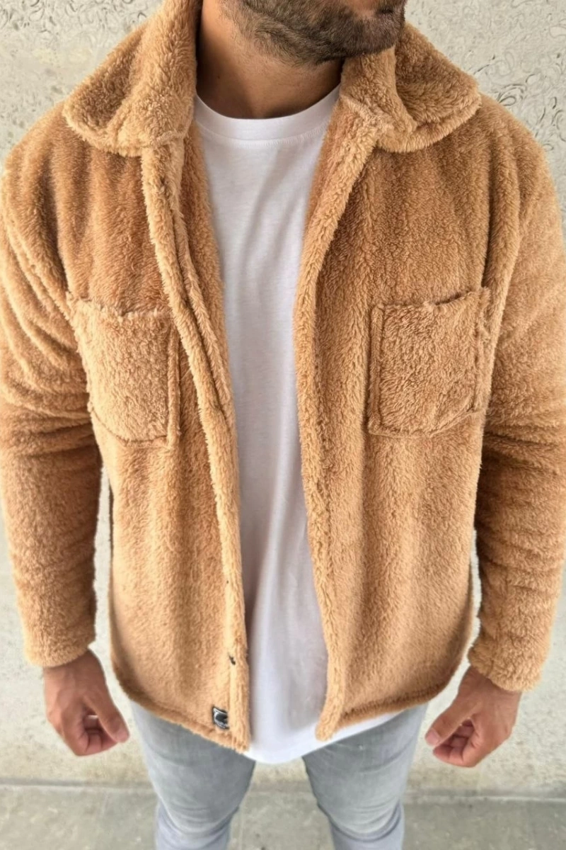 Erkek Pelüş Polar Hırka Gömlek – Yakalı, İlik Düğmeli, Göğüs Cepli, Yumuşak Dokulu Kışlık Regular Fit Rahat Günlük Model - Açık Kahve