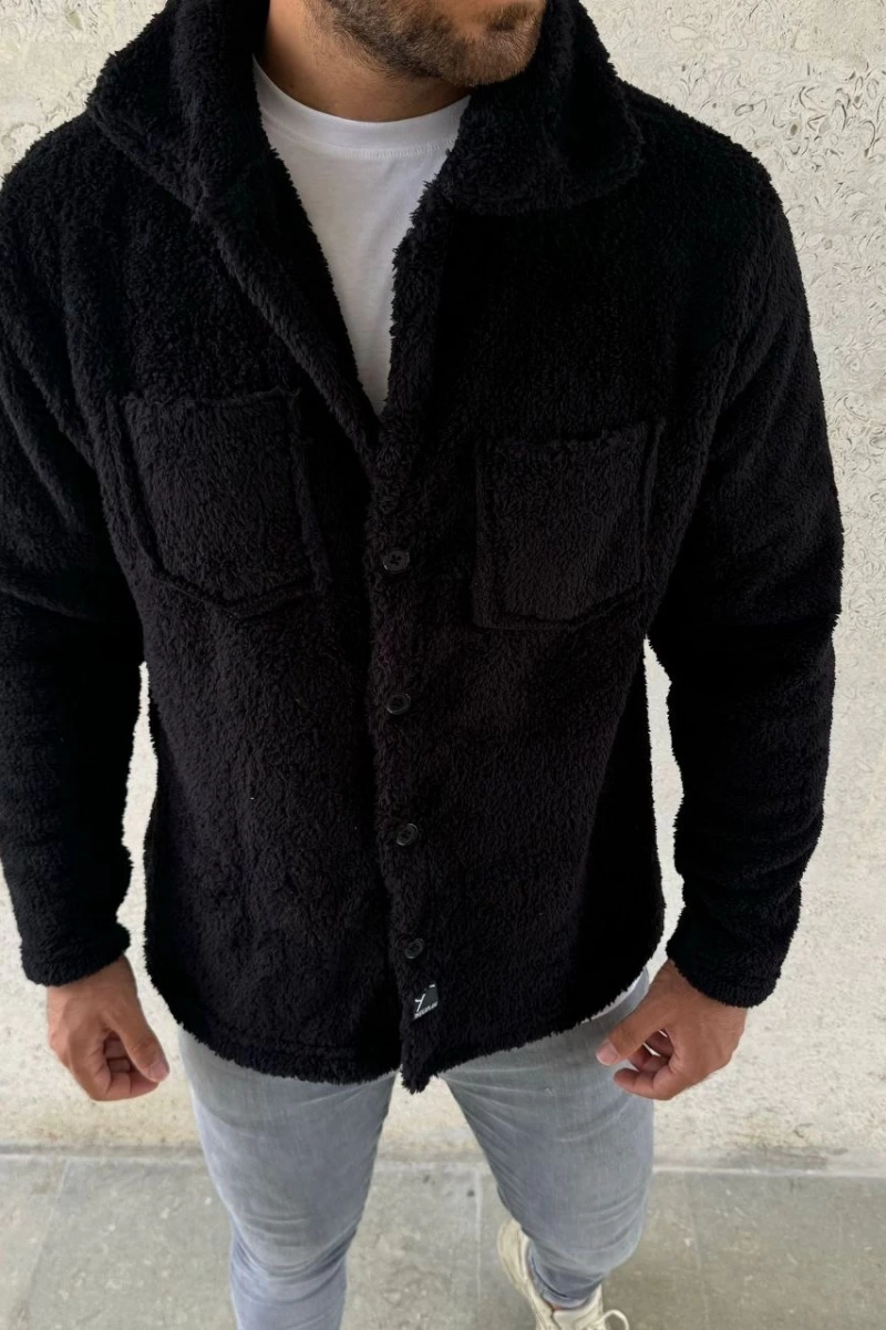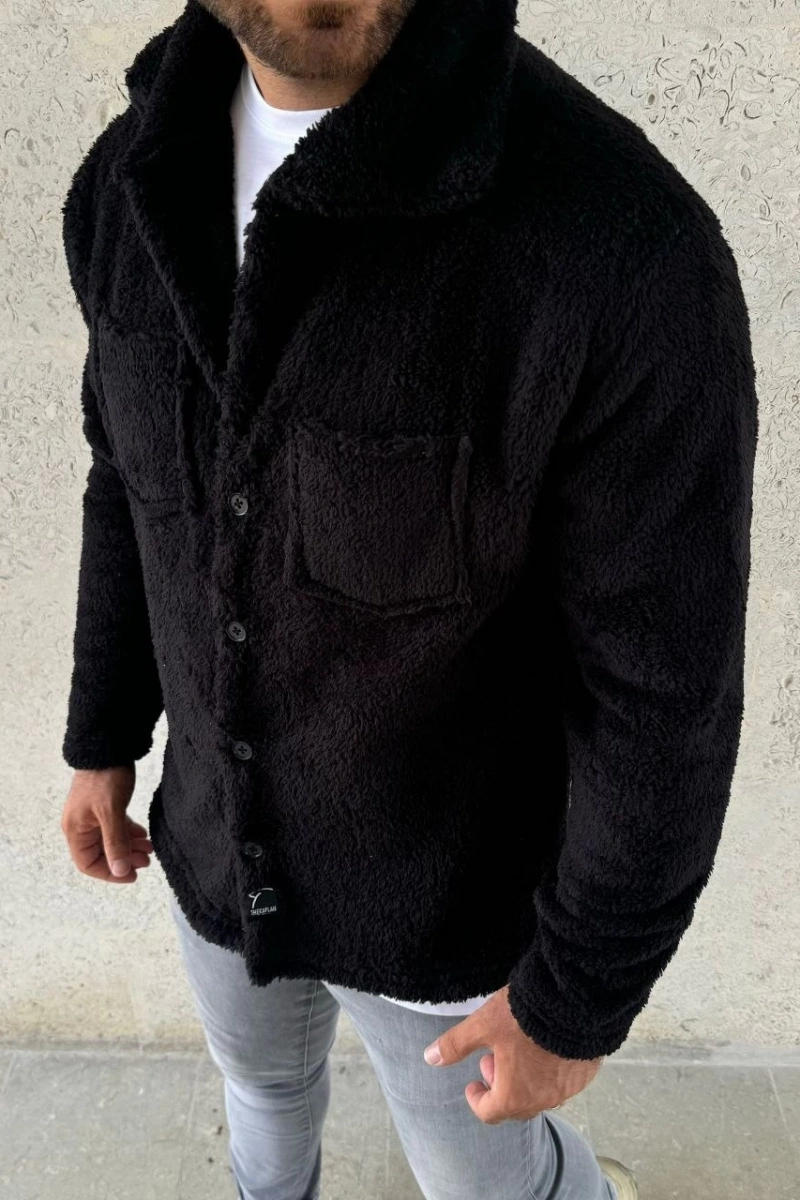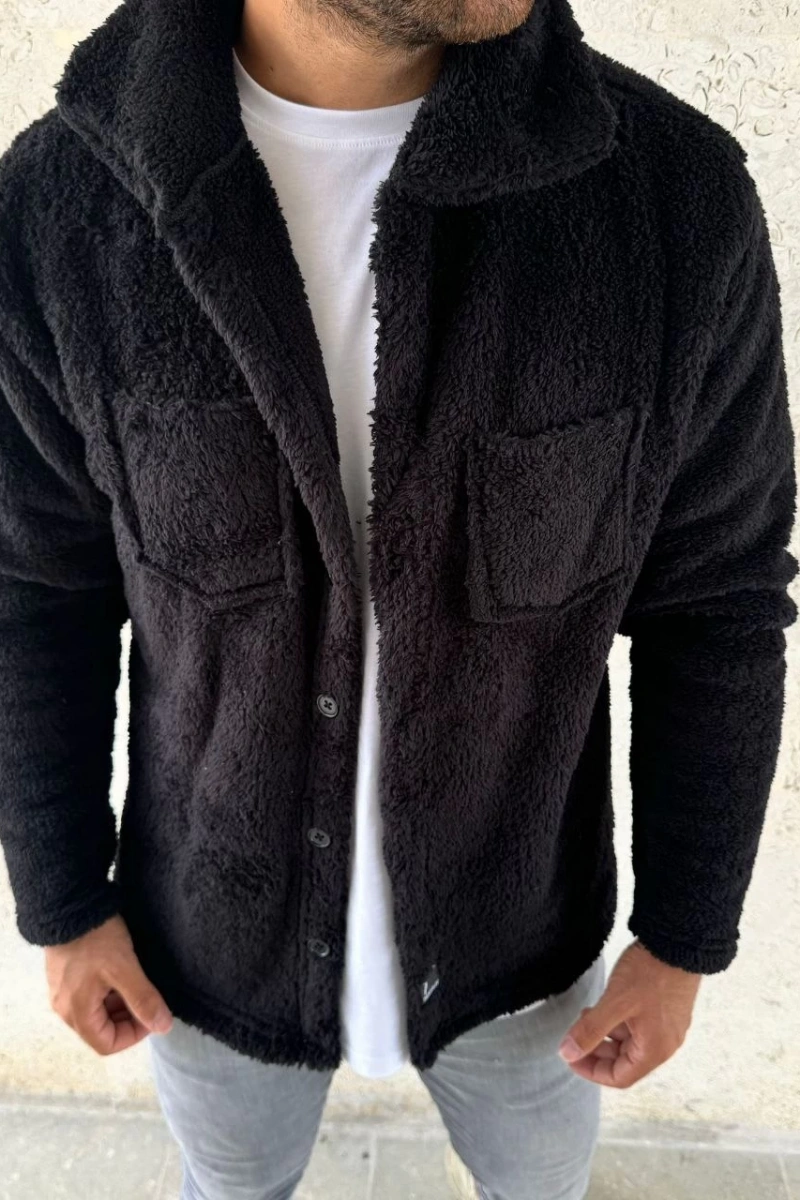 Erkek Pelüş Polar Hırka Gömlek – Yakalı, İlik Düğmeli, Göğüs Cepli, Yumuşak Dokulu Kışlık Regular Fit Rahat Günlük Model - Siyah