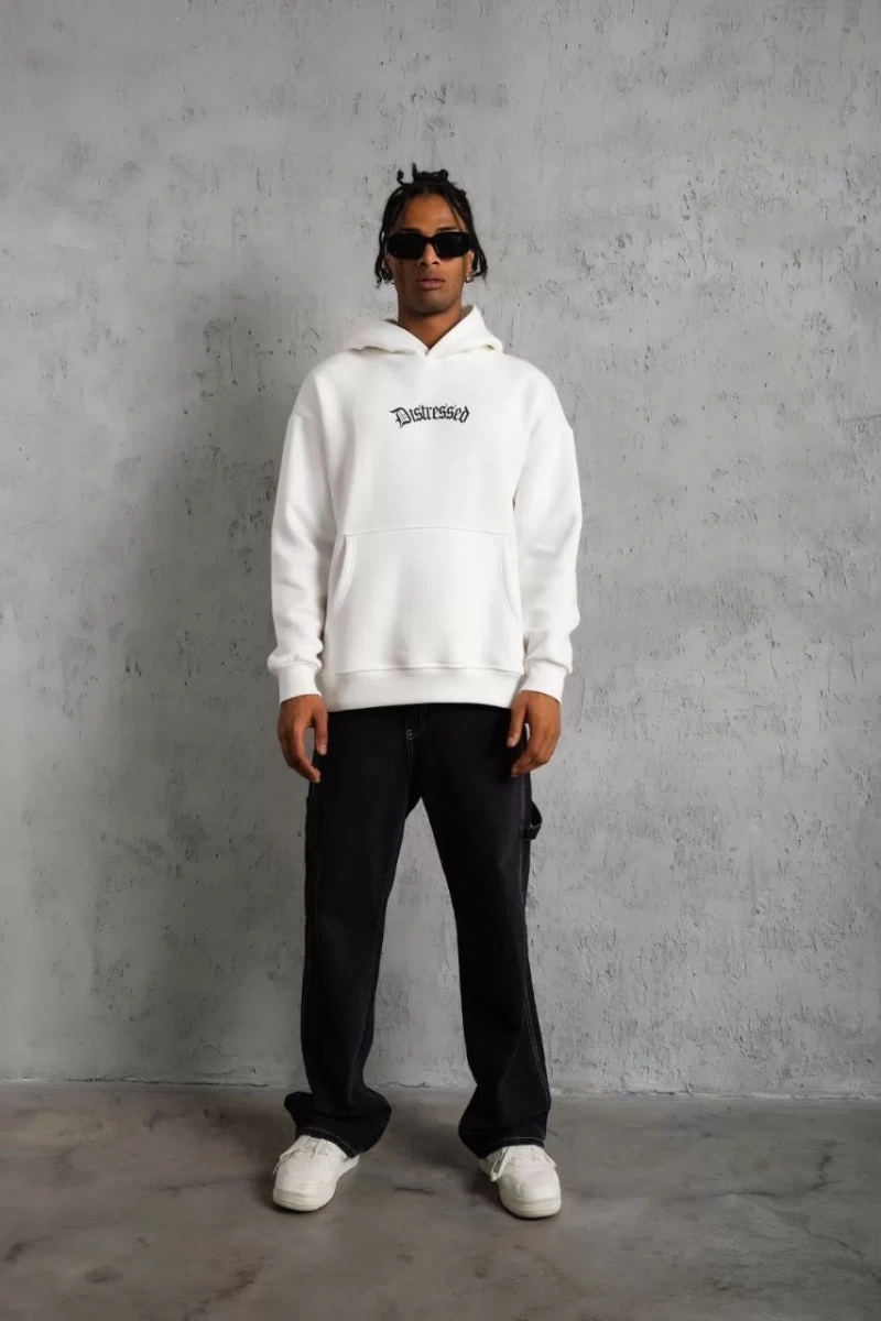 Erkek Üç İplik Baskılı Kapüşonlu Sweat - Beyaz