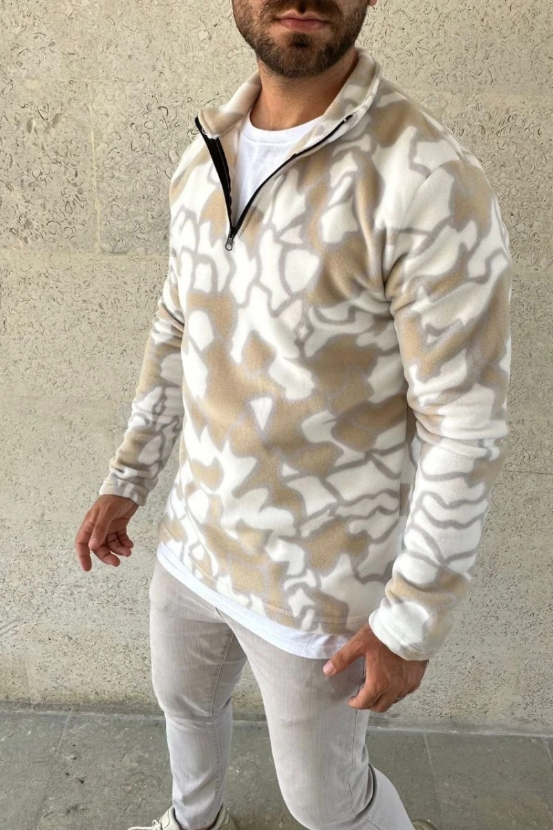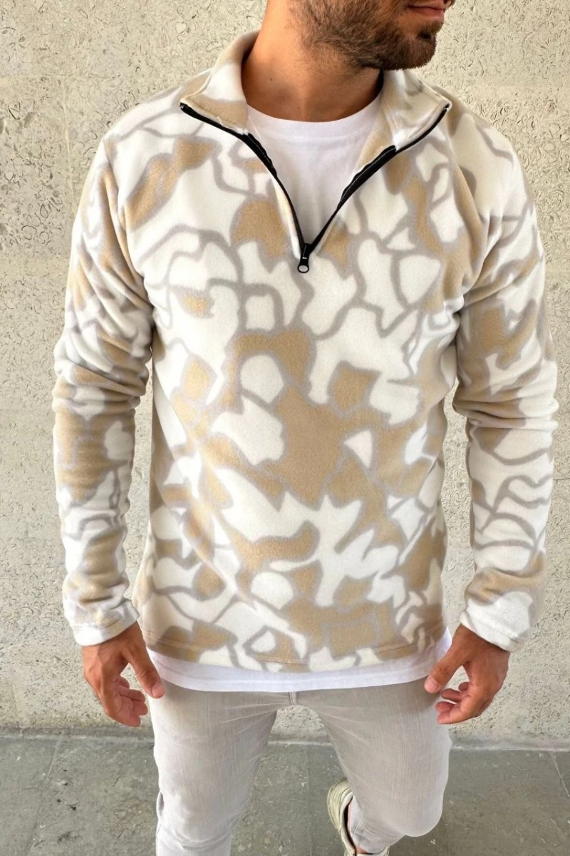 Erkek Yarım Fermuarlı Desenli Polar Sweat Yakalı, Uzun Kollu, Oversize Rahat Kalıp - Bej