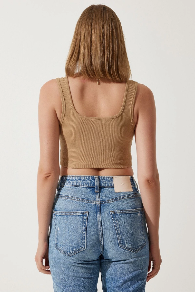 - Kalın askı detayı ve crop kesimi ile trend bir görünüm sunar.