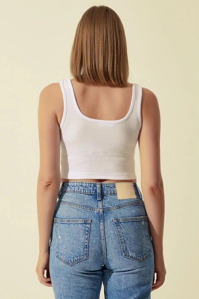 - Kalın askı detayı ve crop kesimi ile trend bir görünüm sunar.