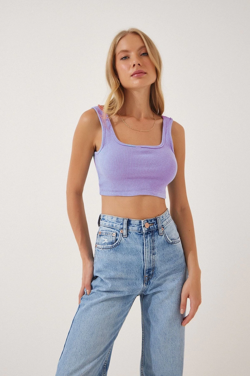 - Kalın askı detayı ve crop kesimi ile trend bir görünüm sunar.