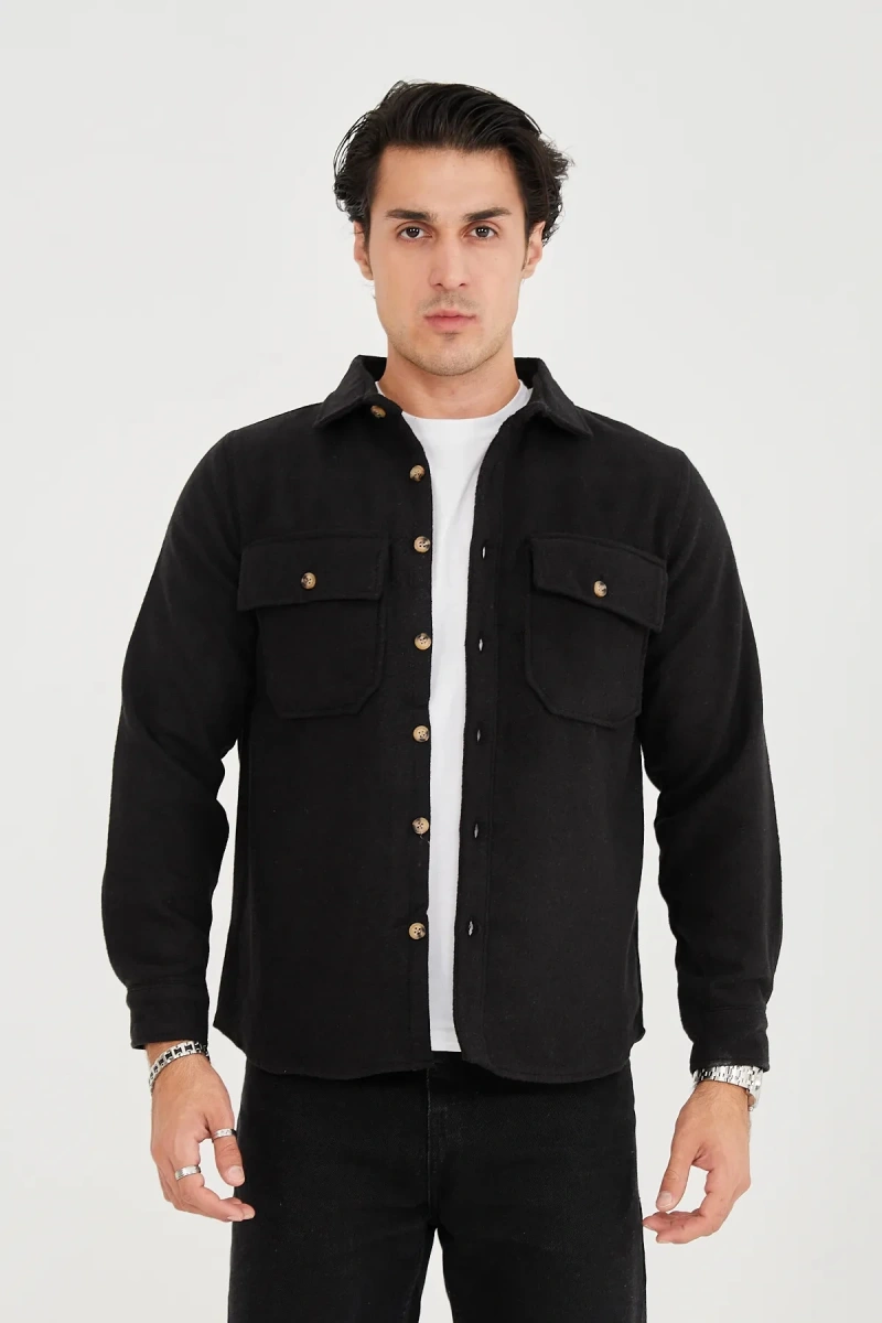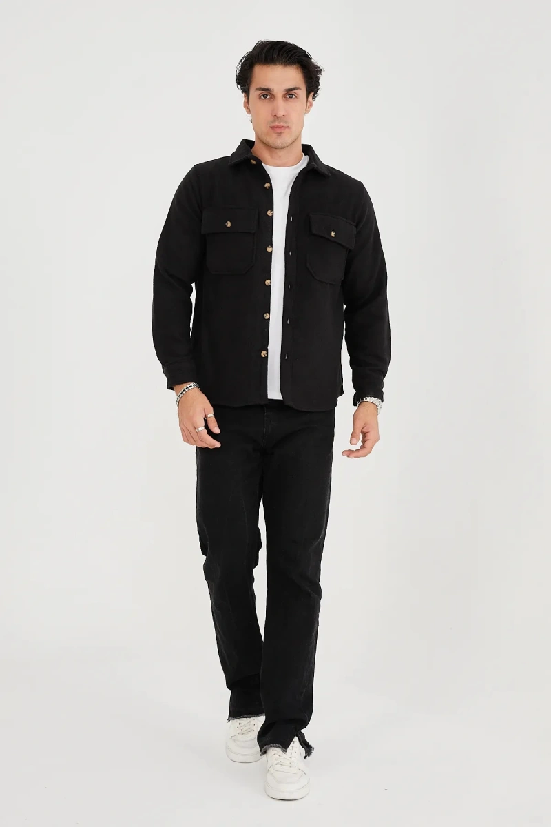 Klasik Yaka Göğüs Cepli Önü Düğmeli Siyah Renkli Erkek Dış Gömlek