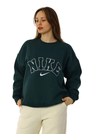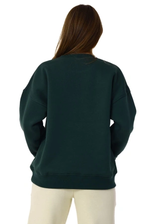 Kadın Bisiklet Yaka Nakış Desenli İçi Pamuklu Oversize Kalıp Sweatshirt Haki
