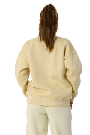 Kadın Bisiklet Yaka Nakış Desenli İçi Pamuklu Oversize Kalıp Sweatshirt Krem